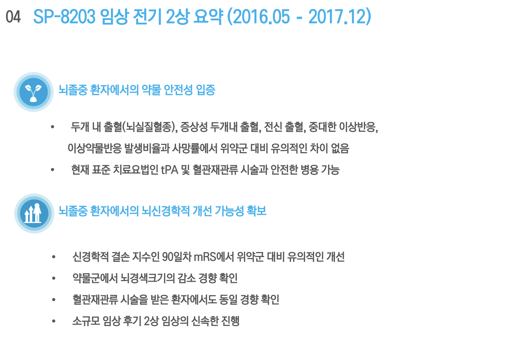 'SP-8203'은 현재 유일한 뇌졸중 표준치료제인 혈전용해제 '액티라제'와 병용했을 때 부작용을 최대한 낮춰주며 뇌경색 크기와 일상 활동에서의 독립적 행동지표의 개선 가능성을 보여주어 시장의 기대감을 한몫에 받고 있습니다.