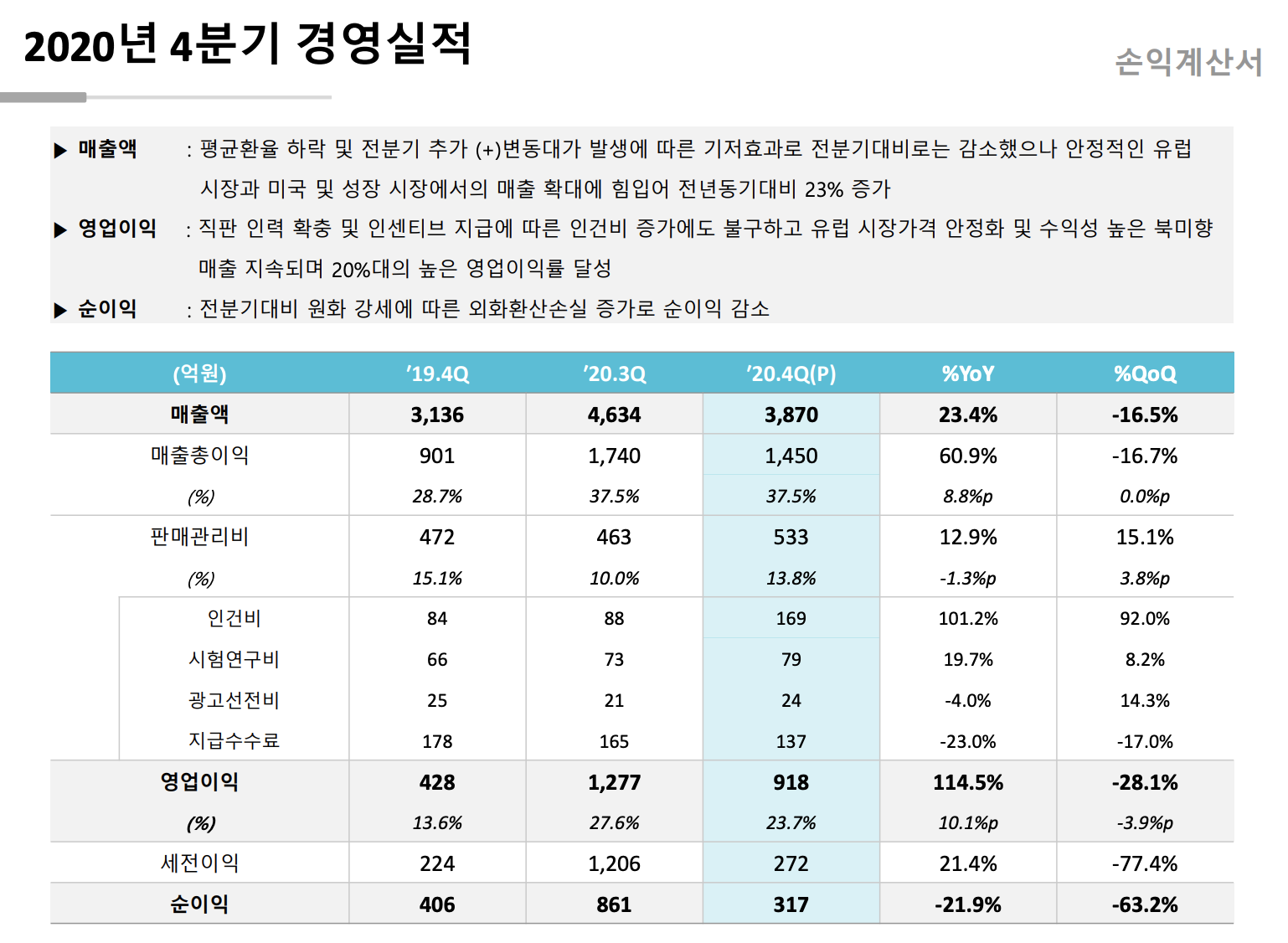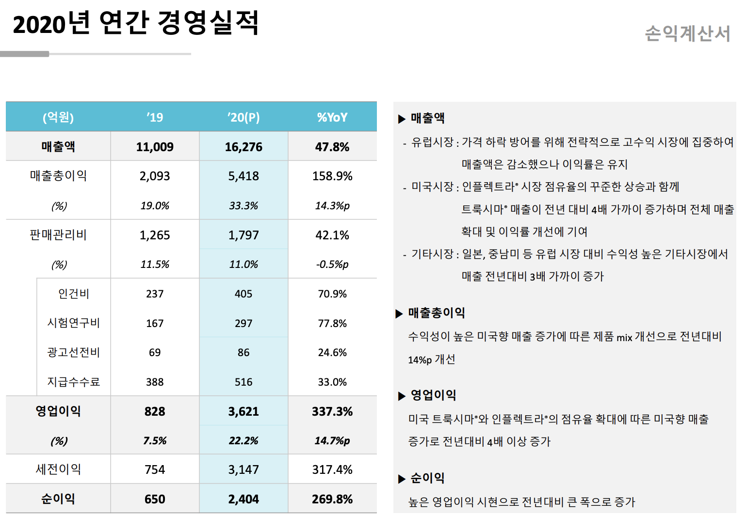 미국에서의 인플렉트라(램시마), 트룩시마의 매출 확대가 실적 확대를 이끈 모습입니다. 특히 트룩시마의 경우 전년대비 4배 가까이 매출이 증가하는 모습을 보였습니다.