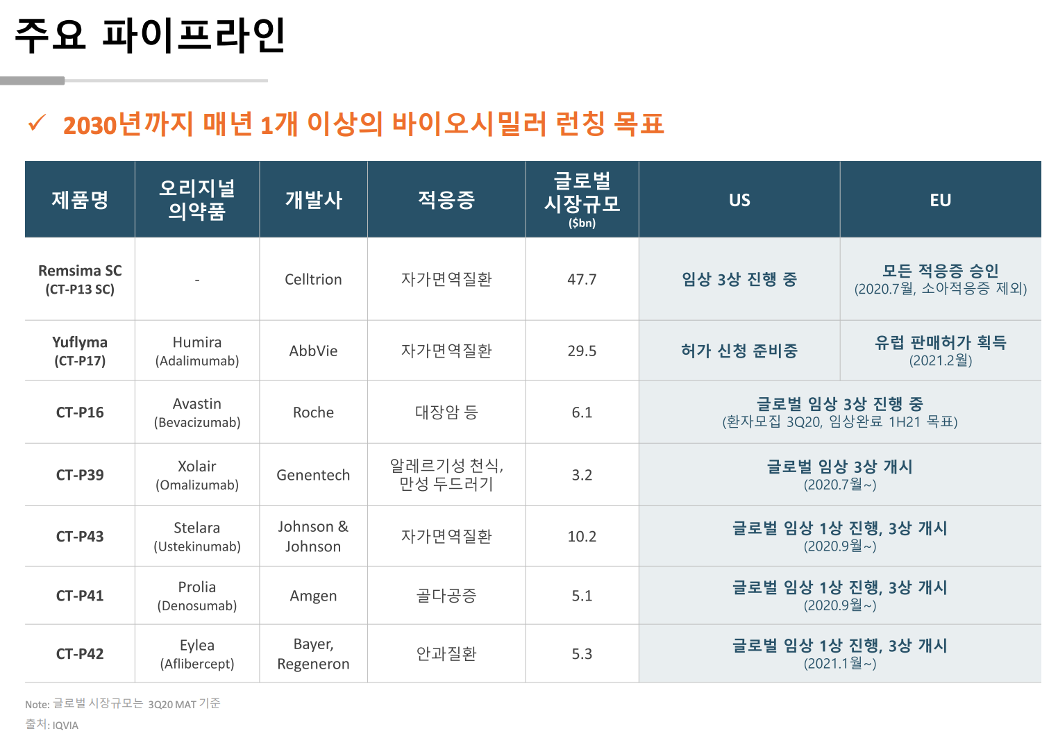 현재 미국에서 램시마SC에 대한 임상 3상을 진행 중이며, 유플라이마는 품목 허가를 준비 중입니다. 두 제품이 미국 시장 진출에 성공한다면 미국향 매출은 더욱 증가하고 고성장의 실적 역시 유지할 수 있을 것으로 보입니다.