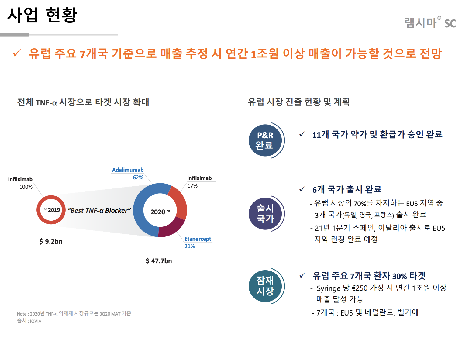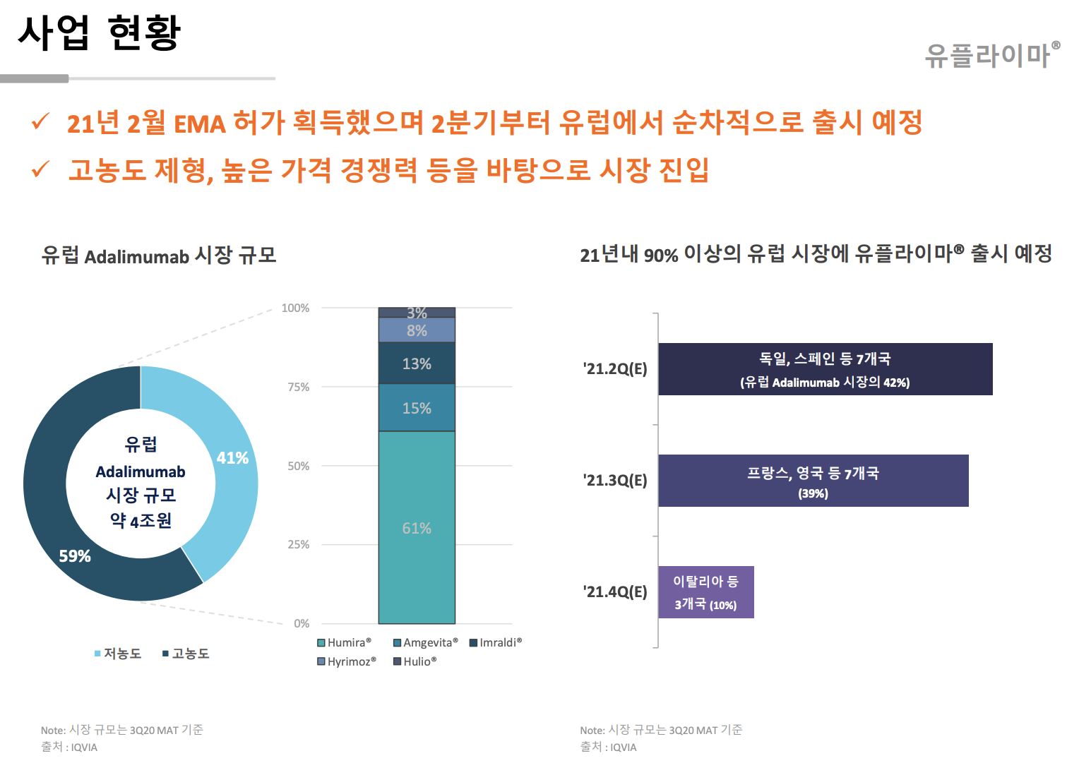 램시마SC는 지난해 유럽에서 거의 대부분의 적응증에 추가 승인을 받았으며 프랑스를 시작으로 이탈리아, 스페인 등 유럽 전역으로 판매를 확대할 예정입니다. 유플라이마의 경우 2월 유럽 판매허가를 받았으며 이르면 올해 중순부터 판매를 시작할 예정입니다.