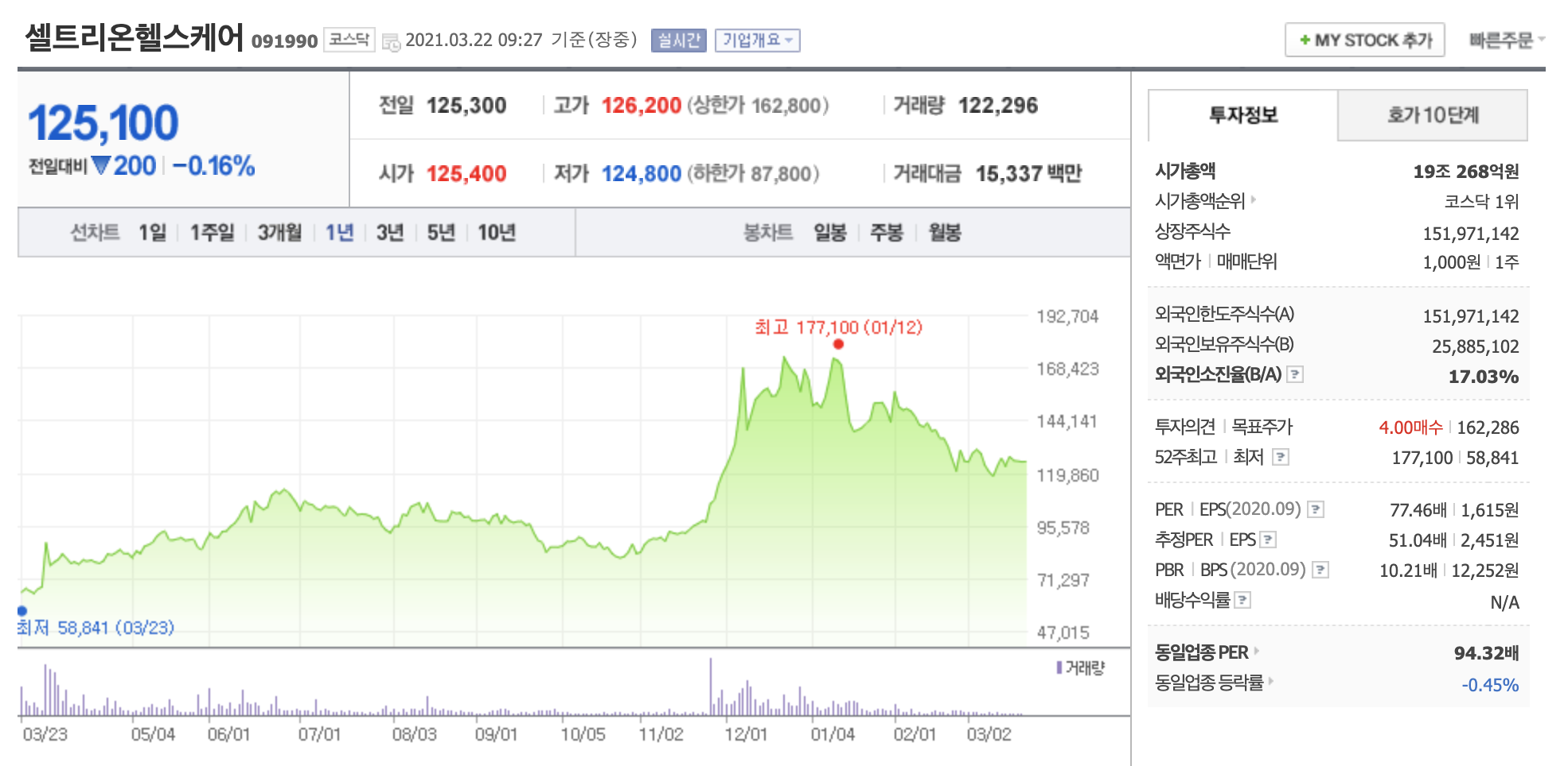 최근 주가는 쉬어가고 있는 모습이나 실적은 올해에도 고성장하는 모습이 예상되고 있습니다. 시장에서는 코로나 19 치료제 렉키로나 수출을 제외하고 셀트리온헬스케어의 2021년 매출은 약 2조원, 영업이익은 약 5,000억원 될 것으로 전망되고 있습니다.