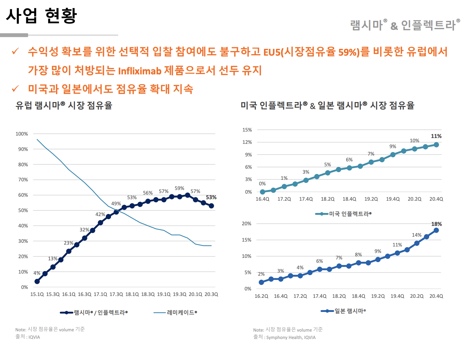 일본 시장에서도 선전하고 있는 모습인데, 램시마의 점유율도 느리지만 꾸준히 확대되는 모습을 보이며 시장점유율 18%까지 도달했으며, 허쥬마 점유율은 2019년 3분기 2%에 불과했으나 2020년 말 기준으로 44%를 기록하며 급성장하는 모습을 보였습니다.