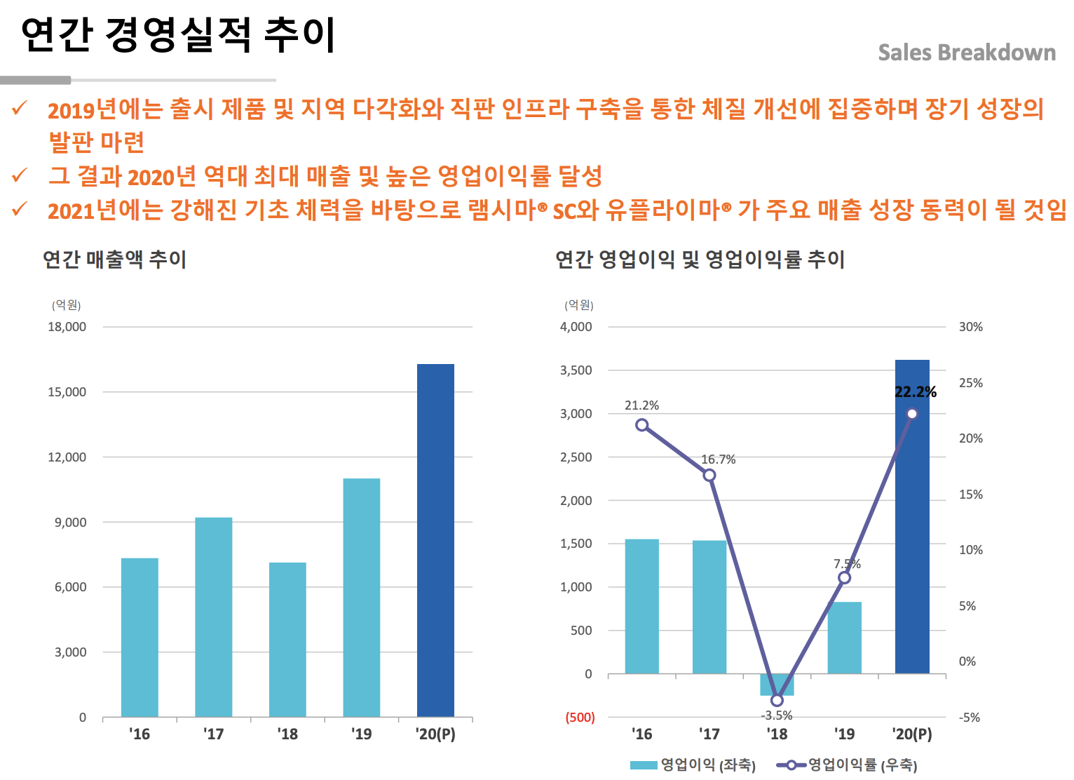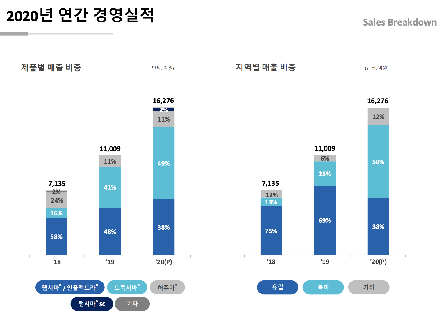 올해도 좋은 실적을 기록할 것으로 전망하는 배경 중에는 신제품 효과를 톡톡히 볼 것으로 분석되고 있습니다. 램시마를 피하주사 형태로 만든 램시마SC와 휴미라 바이오시밀러가 유플라이마가 출시 국가 확대를 통해 매출 규모를 증가시킬 것으로 보입니다.