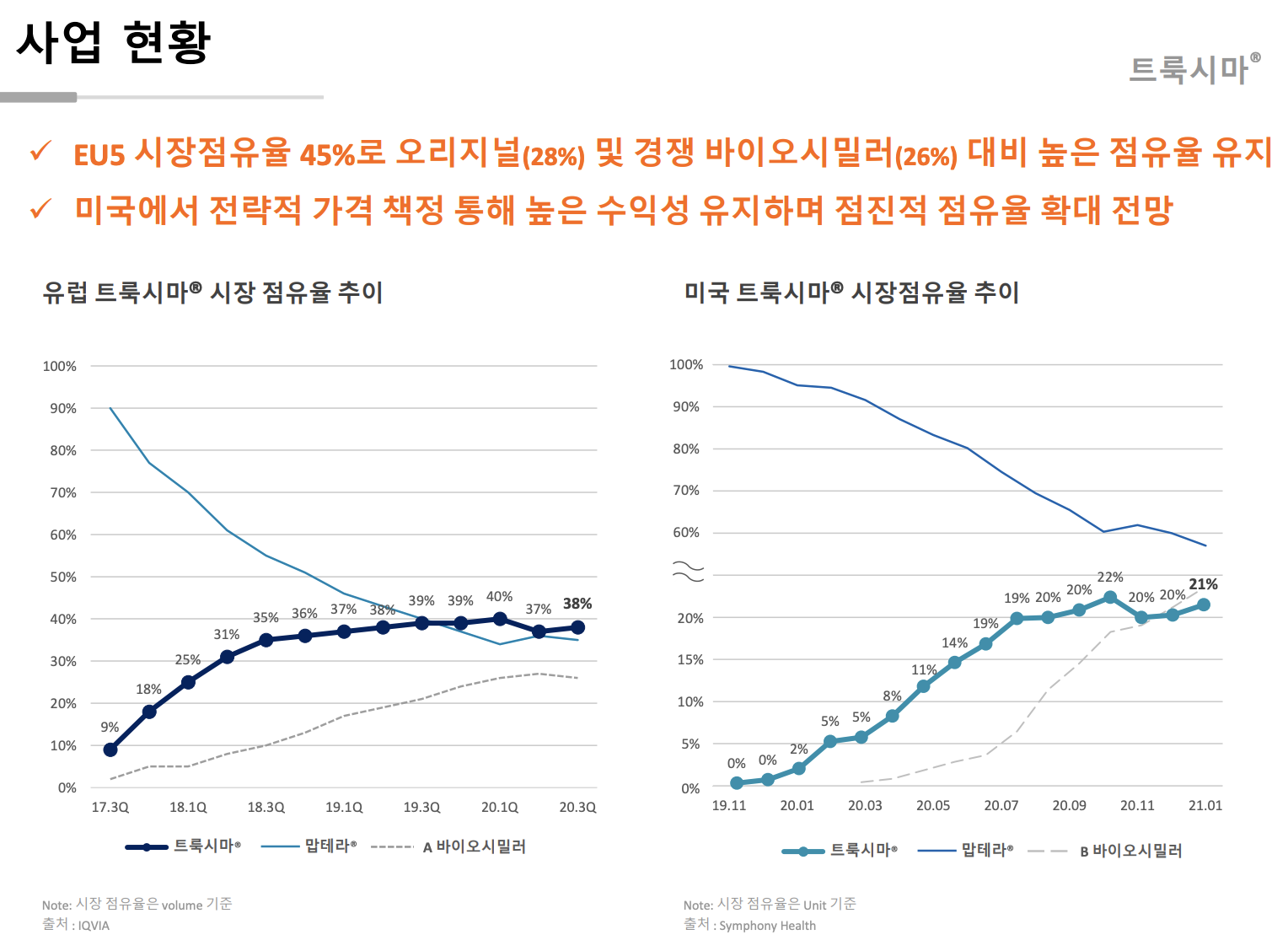 시장조사업체에 따르면 인플렉트라(램시마)의 미국 시장 점유율이 매 분기 확대되어 11.8%에 도달하였으며, 트룩시마는 지난해 3분기 20.4%에서 올해 1월 21~24%까지 점유율이 확대된 것으로 알려졌습니다.