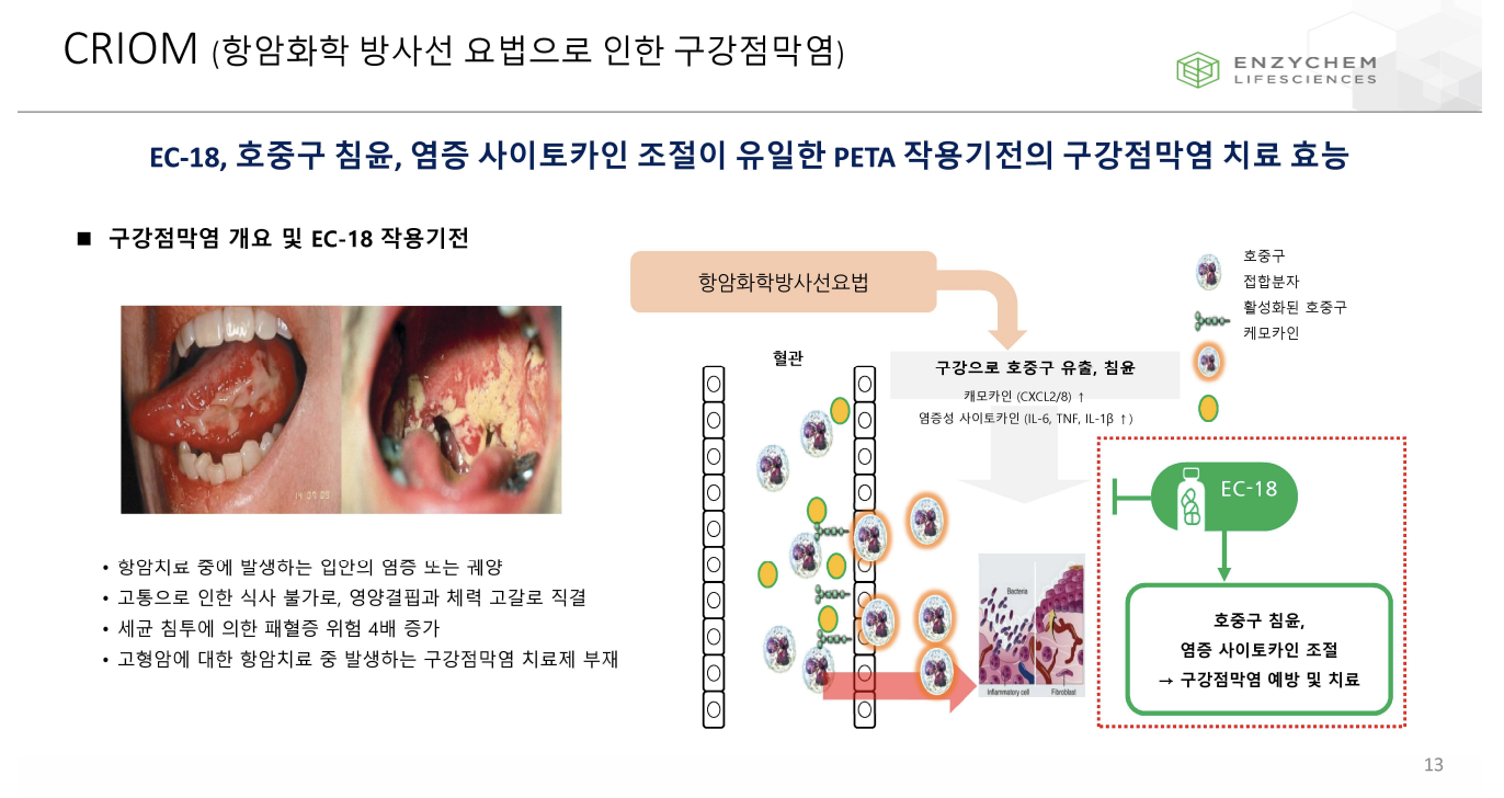 올해 3월에도 신약개발 기업으로는 유일하게 미국 뉴욕헬스포럼에 패널로 참여하여 우주방사선 치료제에 대해 소개했으며 회사 측은 현재 진행 중인 'EC-18'의 급성방사선 증후군 전임상 연구가 종료되면 NASA, 미국 국방부 등을 상대로 기술이전도 가능할 것으로 내다보고 있습니다.