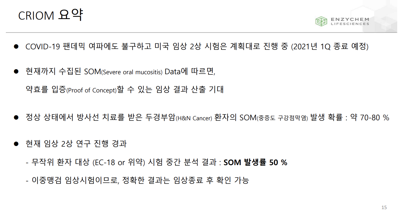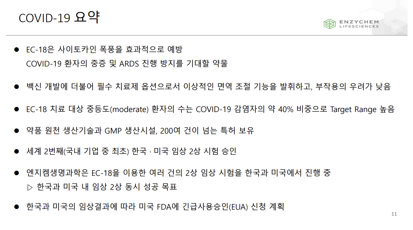 'EC-18'은 코로나 치료제로도 개발되고 있는데 현재 국내 임상 2상 환자 모집을 완료한 상황이며, 임상 종료 후 데이터 결과 분석이 종료되는대로 식약처의 긴급사용승인 혹은 조건부 허가를 신청할 계획입니다.