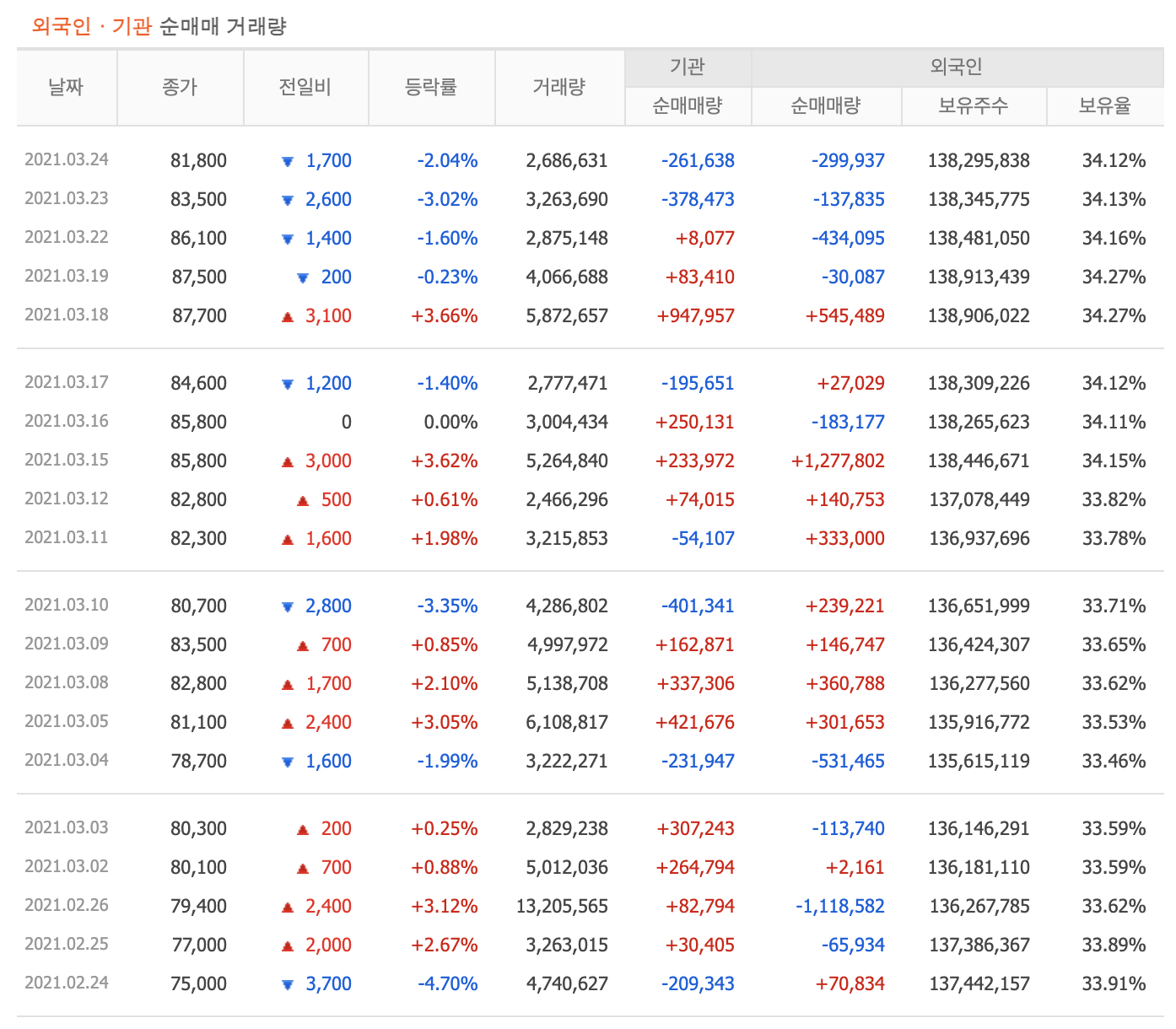 2월 25일부터 기관의 3월 5일부터 외국인의 매수세가 꾸준히 들어오며 좋은 수급 흐름을 보여주었습니다. 3월 셋째 주 외국인과 기관이 약 10조를 순매도하는 와중에도 기아차를 매수하는 모습이었습니다. 외국인은 1,410억원(순매수 2위), 기관은 1,150억원(순매수 1위)어치를 순매수했습니다.