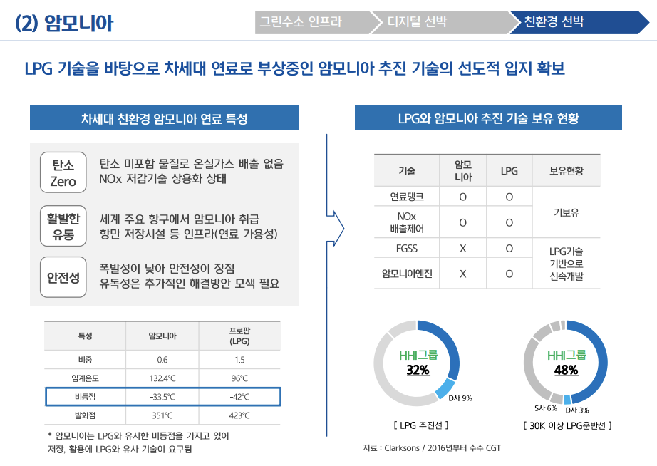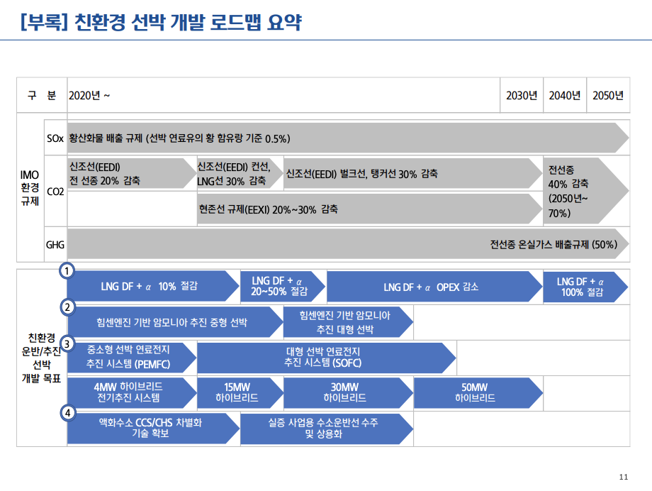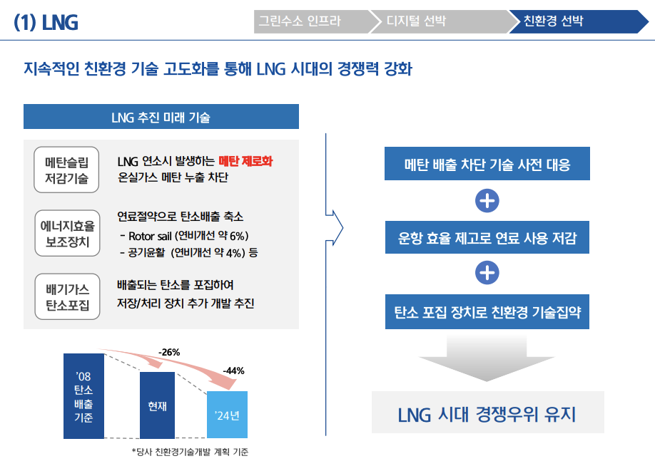 친환경 선박으로는 LNG추진선, 암모니아선, 수소연료추진선을 언급하며 다양한 보조장치 개발 등으로 탄소배출량을 줄이고 친환경 선박을 개발하여 IMO 규제가 본격화되고 있는 상황 속에서 선도적 지위를 확보할 것이라고 밝혔습니다.