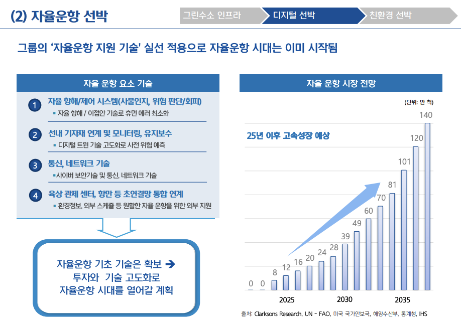 영상데이터 분석 등의 기술을 통한 자율운항지워너시스템 기술을 개발에 집중해 2025년 이후 급성장이 예상되는 자율운항 시장에서의 주도권 확보를 위해 총력을 다할 것이라 말했습니다.
