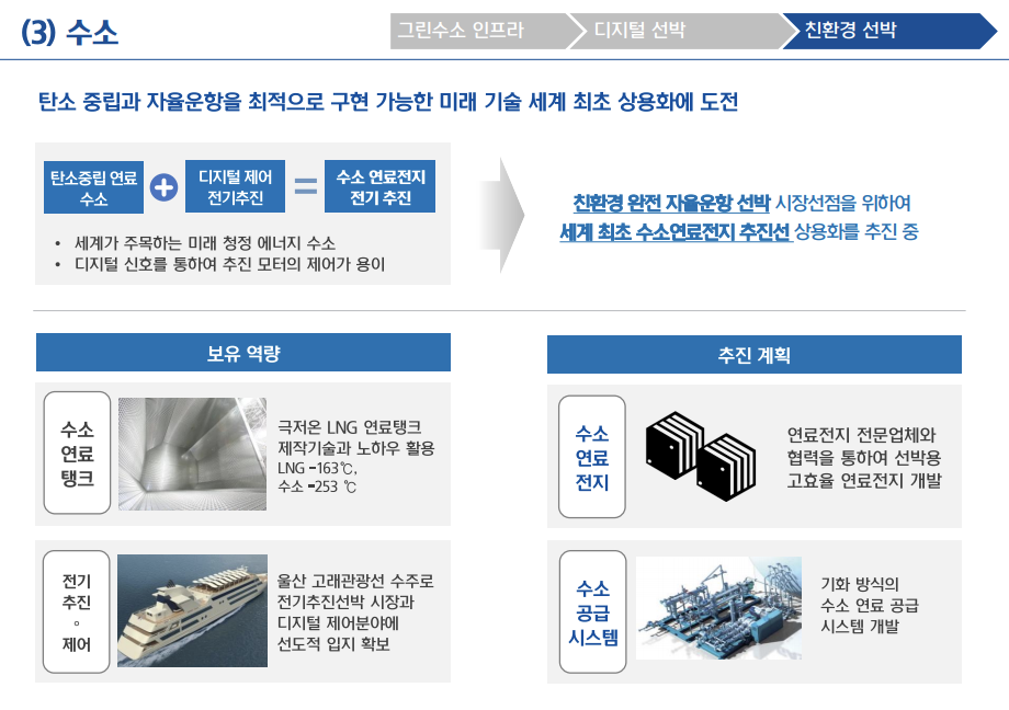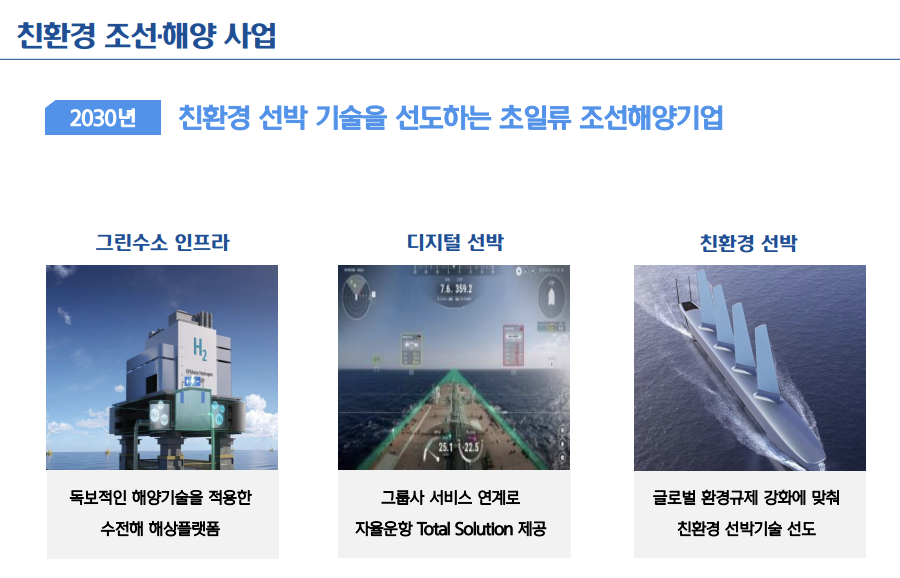 신재생에너지, 해양플랜트, 수전해기술을 융합한 해상 그린 수소생산 플랜트 기술을 선도해나갈 계획이며, 관련 기관과 협력하여 수전해 기술을 확보해 그린수소를 생산하고, 현대차그룹과의 협력을 통해 세계 최초로 상업용 수소 운반선을 선보일 것이라 밝혔습니다.
