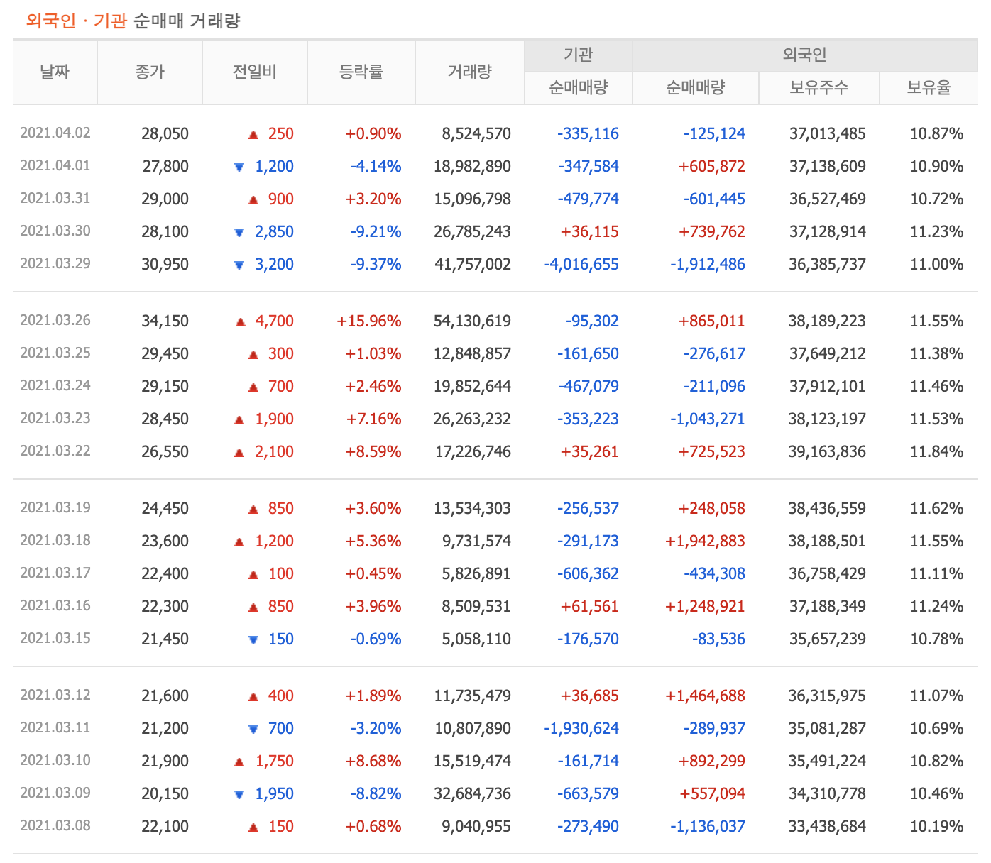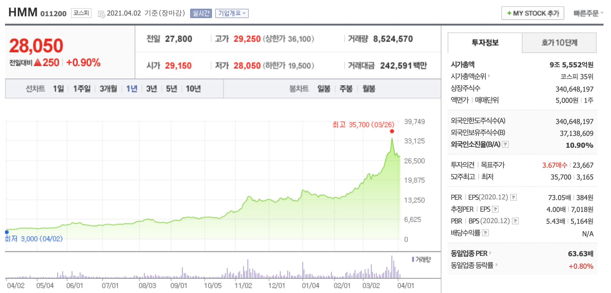 HMM 주가가 3월 26일 장중 35,700원을 터치한 이후 최근 조정을 받고 28,000원 선까지 조정을 받고 있는 모습입니다. 실적 개선세는 분명하지만 단기간 내에 너무 가파른 주가 상승이 부담으로 작용한 것으로 보입니다.