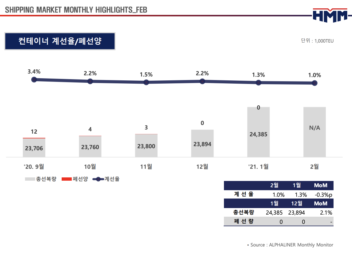 2020년 초대형 24,000TEU급 컨테이너선 12척에 이어 올해 16,000TEU급 컨테이너선 8척을 추가로 투입할 계획입니다. 지난해 3월 HMM 선복량은 43만TEU에 불과했는데 현재는 72만TEU를 넘어서며 글로벌 8위 선사로 자리매김했습니다.