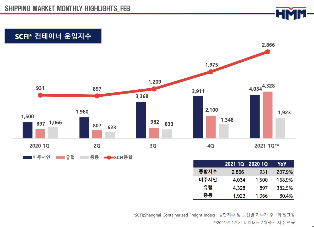 최근 증권가에서의 HMM 실적 전망치를 살펴보면 1분기 영업이익이 1조 원을 넘을 것으로 전망하기도 하고 있습니다. 상하이 해상 운임지수가 여전히 2500포인트 이상을 기록하고 있으며 6주만에 다시 반등하는 모습을 보이고 있습니다.