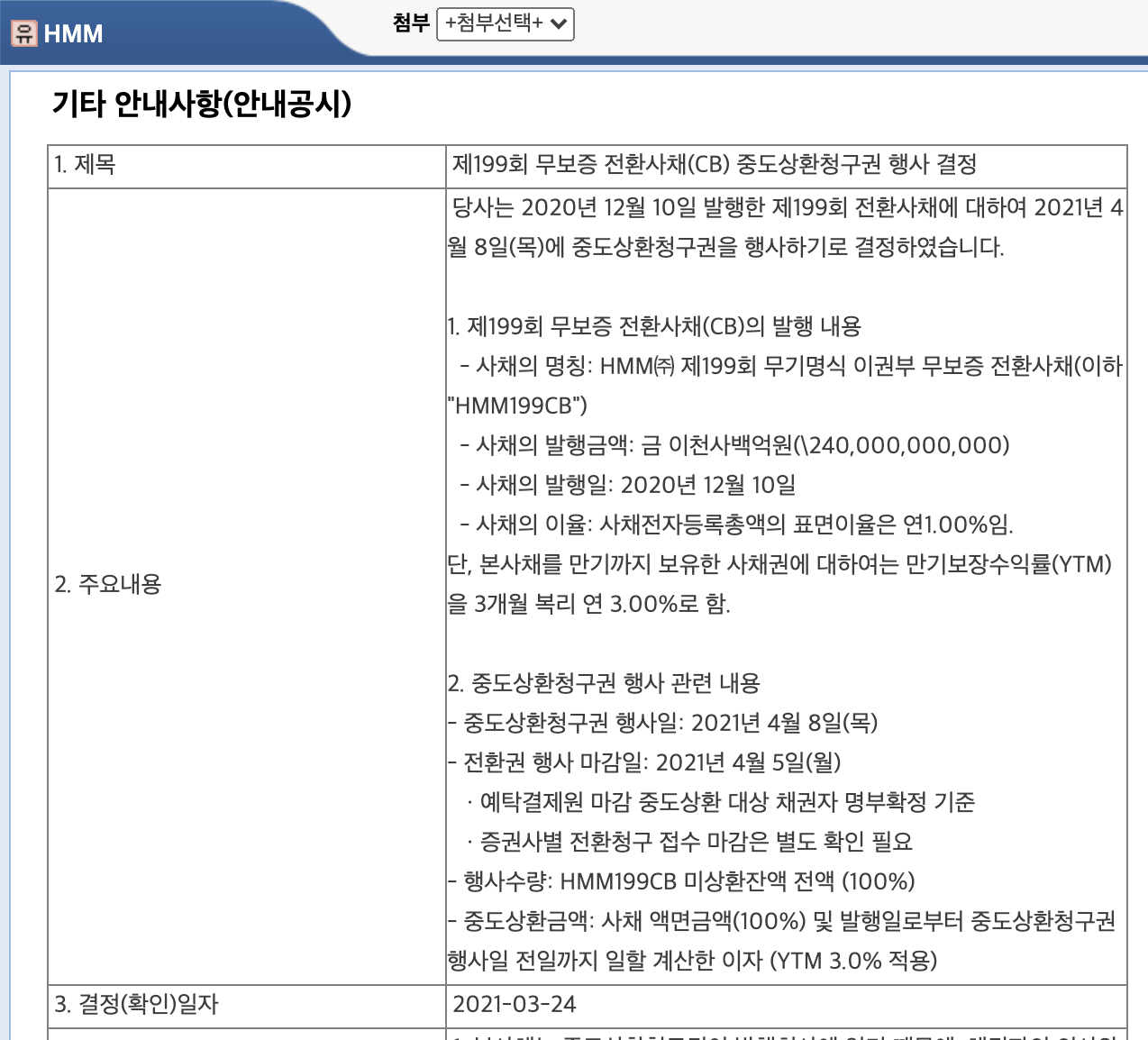 3월 29일 HMM은 지난해 12월 공모한 2,400억 원치 전환사채(CB)를 중도상환겠다고 밝힌 바 있습니다. 조기 상환하는 CB의 경우 5년 만기 이자율이 3%, 주식 전환시 1주당 12,850원에 발꿀 수 있는 권리가 주어져 있습니다.
