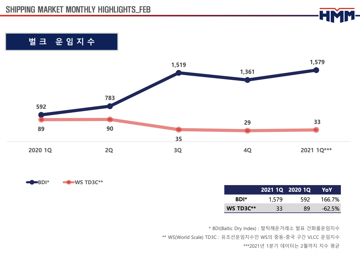 기존 언론에 잘 소개되지 않던 유럽향 운임도 작년 11월부터 폭등하는 모습을 보였습니다. 2020년 10월 TEU당 약 1,000달러 수준이었던 유럽향 운임은 2021년 1분기 4,000달러로 4배 급등하는 모습을 보였으며 이는 컨테이너박스 미순환에 따른 공급부족 영향으로 보입니다. 또한 최근 에버기븐호의 좌초로 수에즈 운하가 가로막히는 일까지 발생해 운임에 대한 기대감이 더욱 커져가고 있습니다.