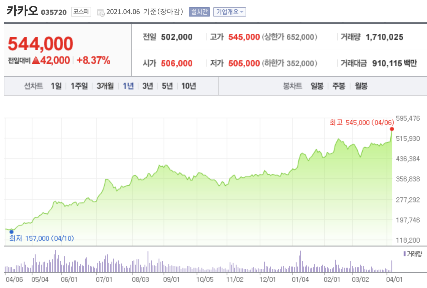 4월 6일 카카오 주가가 강력한 외국인 매수세를 동반하며 8.37% 상승함과 동시에 신고가를 갱신했습니다. 장중 최고가는 545,000원을 기록했습니다. 전일 나스닥 빅테크 상승세를 이어받아 카카오가 달리는 모습입니다.