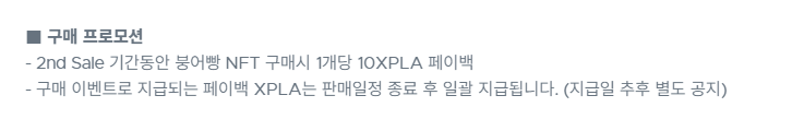 현재 진행되고 있는 2차 민팅에서는 구매 프로모션도 진행되고 있습니다. 붕어빵 타이쿤 NFT를 구매하는 경우 민팅 종료 후 구매한 NFT 1개당 10XPLA를 페이백 해주는 프로모션이 진행 중입니다.