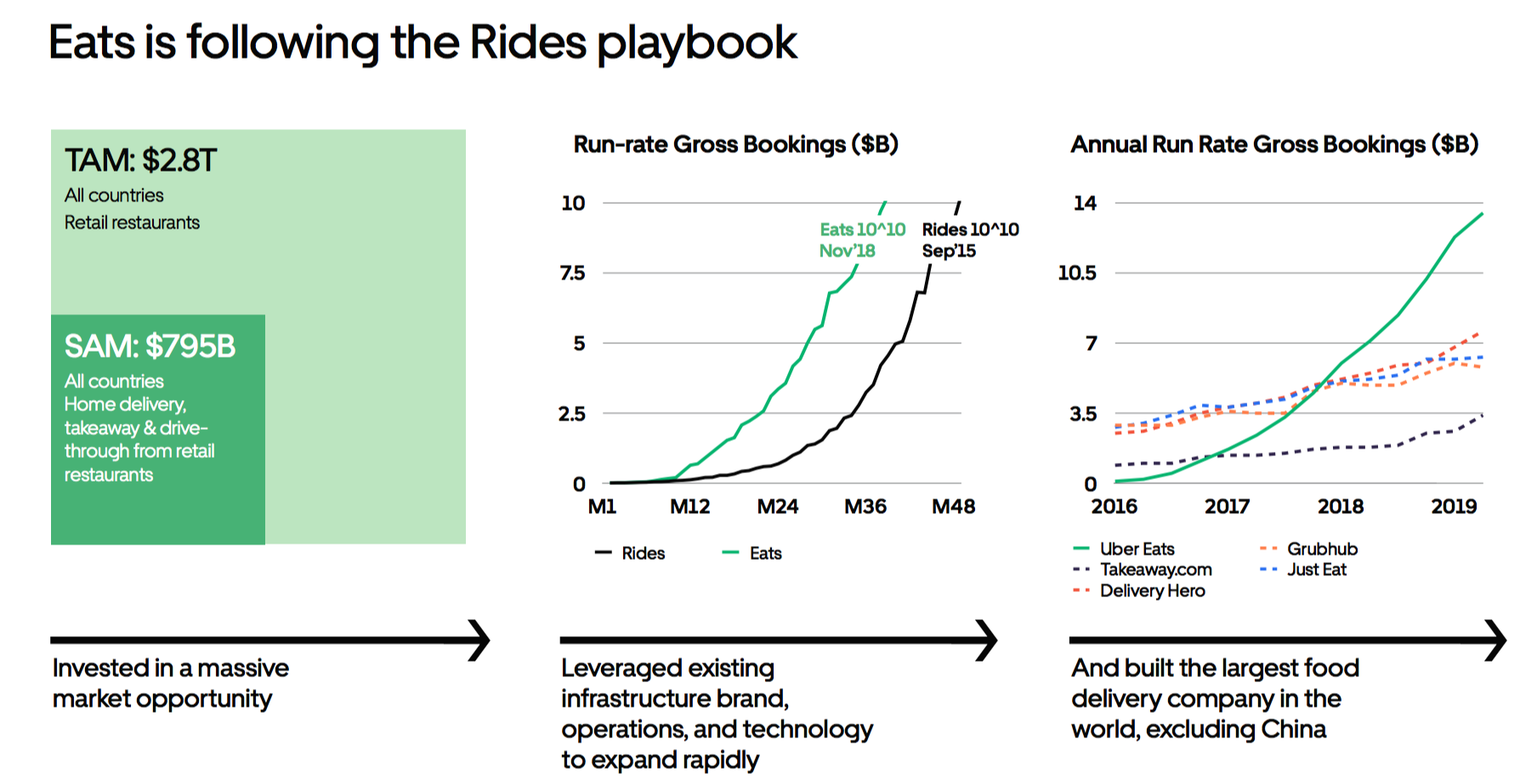 2019년 연간 보고서(아래의 우버 공시자료)에서도 우버 이츠의 성장을 볼 수 있습니다. 서비스 이용이 급격히 늘어나고 있습니다. 다른 음식 배달 회사의 이용 수 역시 같이 증가하면서 배달 시장도 꾸준히 상승하고 있는 것을 볼 수 있습니다.