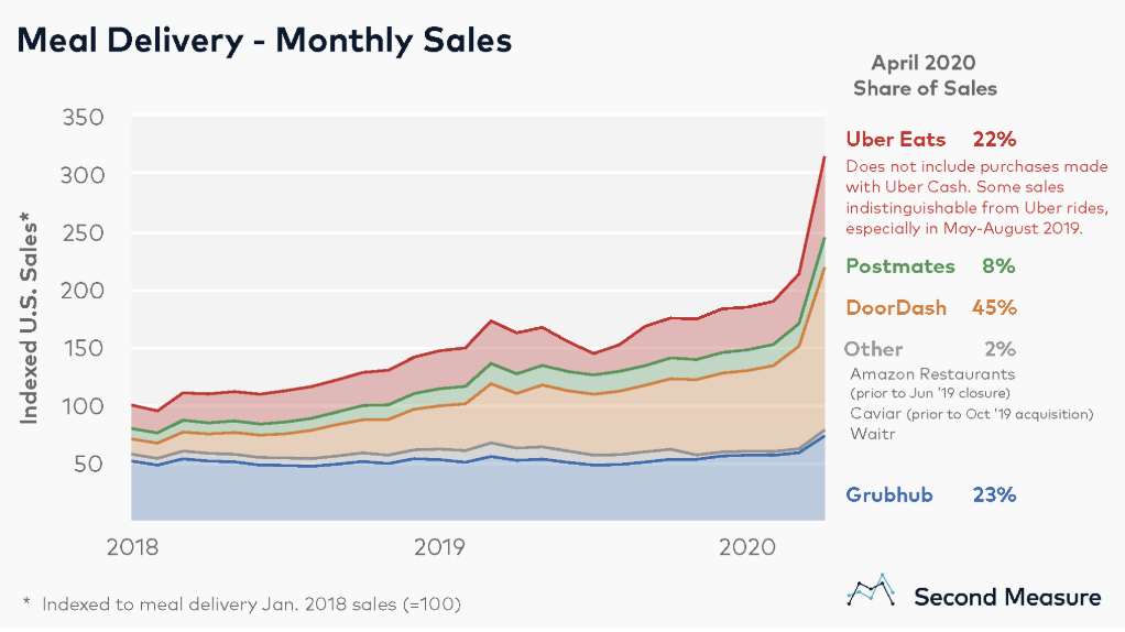 미국에서는 현재 도어대시, 그럽허브, 우버 이츠, 포스트메이트가 치열하게 경쟁 중입니다. 작년까지만 해도 그럽허브가 점유율 1위였지만 도어대시가 공격적으로 사업 확장에 나서면서 4월 미국 음식 배달 시장 점유율 1위의 자리를 차지하고 있습니다. (다른 자료를 찾아보게 되면 점유율이 다르게 나오기도 합니다 그만큼 경쟁이 치열하다는 것이겠죠)