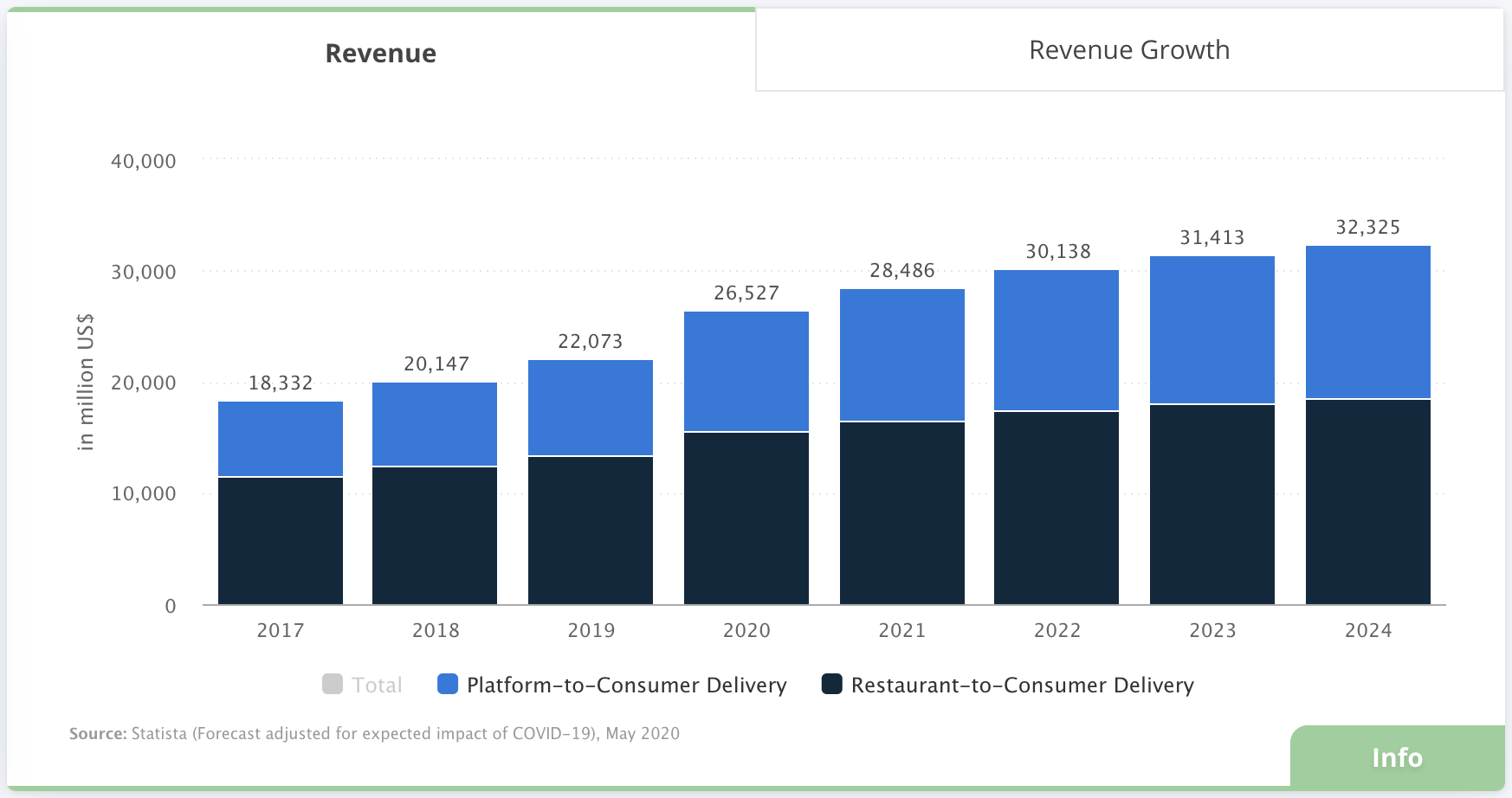 미국 포함 전세계 배달 시장은 성장세를 보이고 있습니다. 전 세계 음식 배달 업체들은 공격적으로 사업 확장에 나서고 있습니다. 작년에는 딜리버리 히어로(DH)가 배달의 민족을 인수하기도 했죠. 코로나로 인해 1분기 우버의 탑승자 수가 급감했지만(전년도 대비해서는 상승) 그럼에도 불구하고 우버 이츠의 이용자는 오히려 증가했습니다. 사람들이 집에서 안 나오기 때문이겠죠.