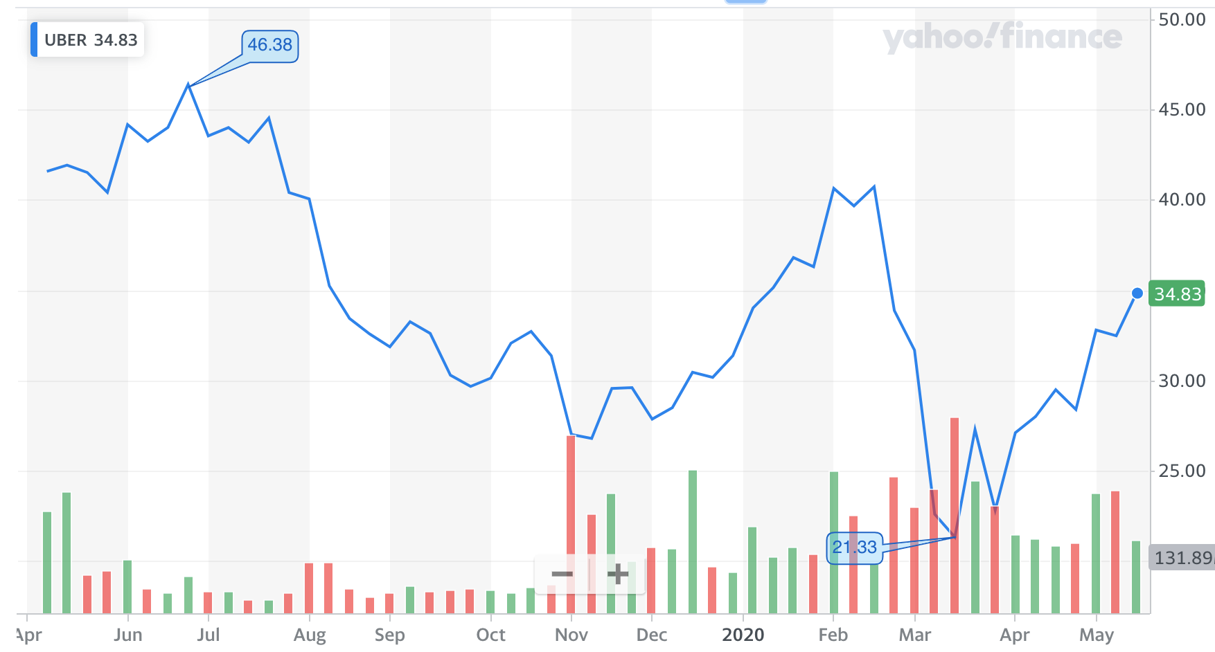2019년 5월 한껏 기대를 모으면 상장(공모가 45$) 했다가 엄청난 적자를 발표하면 주가가 떨어져 25불까지 도달했습니다. 이후 차츰 회복이 되다가 20년 올해 말까지 흑자전환이 가능할 것이라는 전망이 발표되면서 다시 주가는 급등하게 됩니다. 이후 코로나가 터지면서 바닥을 터치했다가 현금이 12조가 있다는 얘기를 하면서 급등하였고 그 추세를 타고 지금 가격까지 오게 되었습니다.
