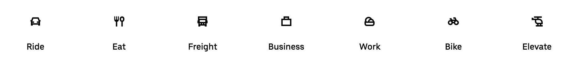 우버의 현재 주력 사업은 차량 관련 서비스 (우버X, 우버 블랙, 우버 풀), 음식 배달 서비스 (우버 이츠)가 있습니다. 이외에도 사업은 진행하고 있으나 매출이 적게 일어나거나 시범적으로 운영하고 있는 사업들에는 화물 운송 서비스(우버 프레이트), 작은 모든 것을 배달하는 서비스(마이크로 모빌리티), 자전거 대여 서비스(우버 점프), 항공 운송 서비스(우버 에어), 자율 주행 연구 등이 있습니다.