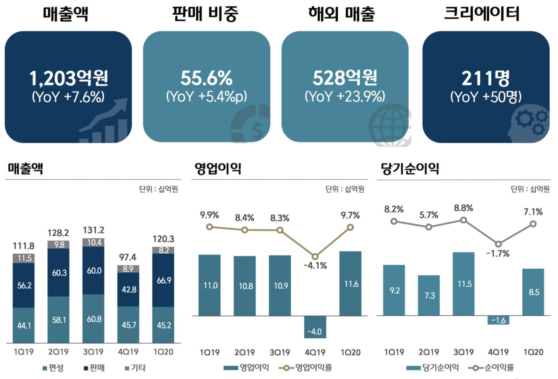 올 1분기 괜찮은 성적을 가지고 온 스튜디오 드래곤입니다. 가능성을 보여준 실적인데요, 스튜디오 드래곤은 1분기 매출액 / 영업이익 / 순이익 순으로 연결 기준 1203억 / 116억 / 85억 을 기록했고 전년 동기 대비 성장률을 본다면 7.6% / 5.5% / -7.3%를 달성했습니다. 인상적인 점은 매출액 중 판매 매출이 전년 동기 대비 19.1% 증가한 669억 원을 기록하면서 강력한 성장세를 보였습니다. 수출 또한 전년 동기 대비 100억이 증가했습니다. 이는 넷플릭스, OTT향 콘텐츠 공급량 증가와 판매 가격 증가에 따른 것으로 보입니다. 예상만 했던 것들이 실제로 수치로 드러난 1분기 실적이었습니다.