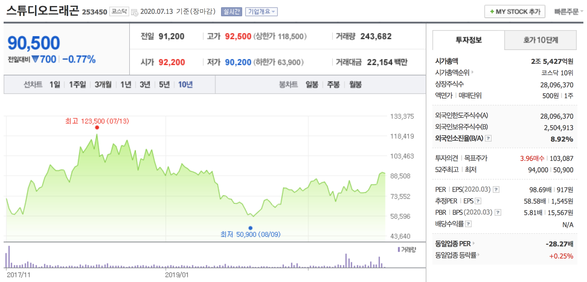 상장 후 급격한 상승을 보이다가 쭉 떨어졌다. 19년 5월 대규모 투자를 한 <아스달 연대기> 방영을 앞두고 주가가 폭락했습니다. <아스달 연대기>가 방영을 시작한 후 처참한 모습을 보이자 최저점을 직고 다시 반등했습니다. 재미난 점은 코로나 19 사태보다 <아스달 연대기>로 인한 실망감이 주가에 더욱 큰 영향을 미쳤다는 것입니다. 7월 13일 종가 기준 9만 원 선을 유지하는 모습입니다. CJ ENM 이 자금이 필요할 때 스튜디오 드래곤 지분을 조금씩 팔아서 마련하는 모습을 종종 보였는데 차후 어떤 식의 행보를 보일지 지켜볼 필요가 있어 보입니다.