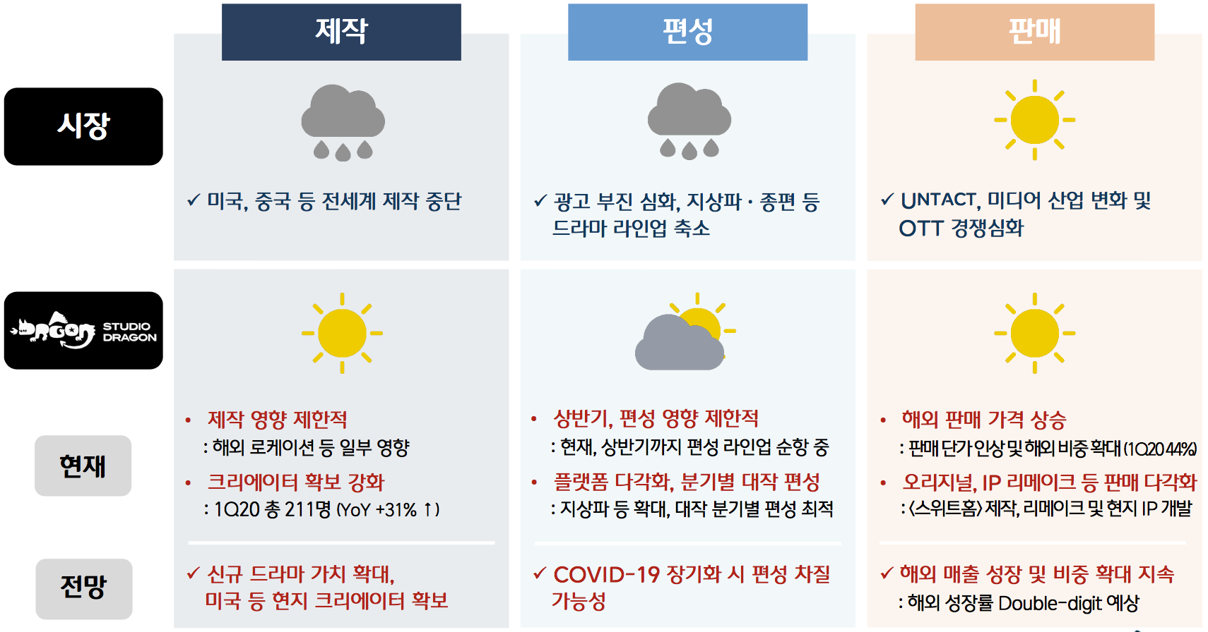 하지만 코로나 19 여파에도 불구하고 스튜디오 드래곤에게는 오히려 위기가 기회로 바뀌었습니다. 한국의 코로나 19 사태가 다른 나라에 비해 안정을 되찾아 가면서 드라마 제작에 있어서도 큰 타격은 없으며 편성 역시 영향이 제한적입니다. 판매에 있어서는 엄청난 모멘텀에 놓여 있습니다. 코로나 19로 인해 외출이 힘들어지자 '홈코노미'라는 말이 생겨날 정도로 집에 있는 시간이 늘어났고 전 세계 방송국, OTT 플랫폼(넷플릭스, 디즈니 플러스, HBO MAX 등) 트래픽이 급증하였습니다. 이 기회를 놓칠 수 없는 OTT 플랫폼들이 수많은 콘텐츠들을 제작, 구입에 나서며 시장의 경쟁이 치열해지고 있습니다.