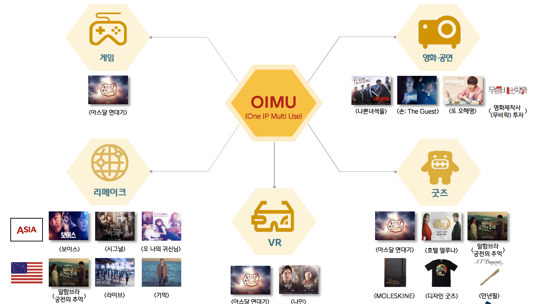 미국, 할리우드 작품들이 콘텐츠를 하나를 가지고 수많은 상품들을 만들어 큰 수익을 올리고 있습니다. OSMU, OSMI의 대표적인 사례들이 디즈니 만화, 마블 시리즈, 드라마 <워킹 데드>, <왕좌의 게임>등이 대표적인 예이며 94~95년 방영되었던 미드 <프렌즈>의 경우 아직까지도 많은 사랑을 받으며(특히 한국에서는 영어공부 쉐도잉 용으로 각광) 여러 OTT 플랫폼에서 만나볼 수 있습니다. 스튜디오 드래곤도 비슷한 전략을 구상하고 실행에 옮기고 있습니다. 각종 리메이크작, 영화화, 공연화, 굿즈 등을 만들어 냈고 시즌제로 기획된 <아스달 연대기> IP를 통해서 게임, VR 등 더욱더 다양한 분야에 진출 중입니다. CJ ENM이 지분을 가지고 있는 에이스토리의 경우 <킹덤>이 대박을 치면서 시즌이 2개밖에 진행되지 않았지만 IP 활용에 적극적인 모습입니다.