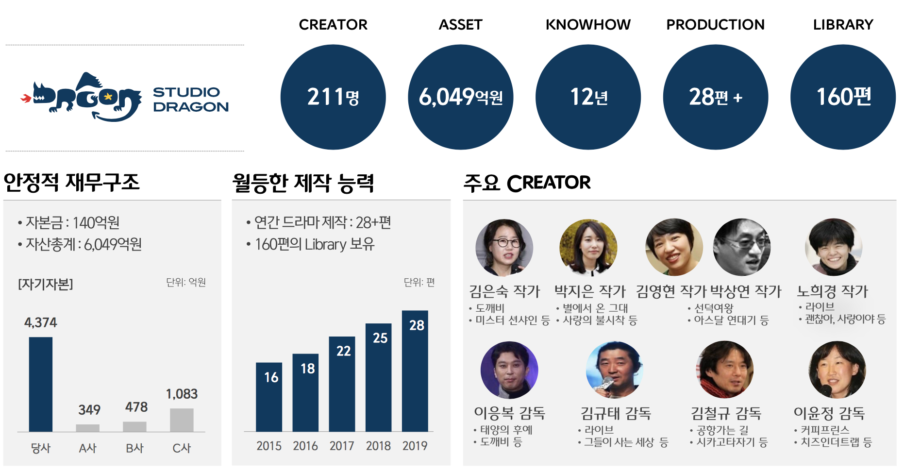 CJ ENM에서 분리된 스튜디오 드래곤은 종합 스튜디오로서 최고의 환경을 갖추고 있습니다. 자본금도 제작사 치고 클 뿐만 아니라 드라마 기획/개발, 제작, 판매, 유통을 하기 위한 최고의 환경에 놓여있습니다. 기존 유명한 작가, 감독들이 소속되어 있는 문화창고, 화앤담 픽쳐스, KPJ, 지티스트 등을 인수하며 기획/개발 역량을 최대치로 끌어올렸습니다. 또한 8개의 독립적인 기획/제작 팀을 운영하고 있는데 넓은 인재풀로 최고의 시너지를 낼 수 있는 팀을 만들어 냅니다. 드라마 판에서는 어느 작가의 작품이냐가 투자, 캐스팅 등에 가장 영향을 많이 미치기에 이미 탑 급 크리에이터들을 보유함과 동시에 스튜디오 드래곤의 네임밸류로 이점을 가져가고 있습니다. 또한 넷플릭스와의 협력을 통해서 텐트폴 드라마의 대규모 투자 및 선판매 등을 통해서 안정적인 제작 환경들을 만들어 나가고 있습니다.