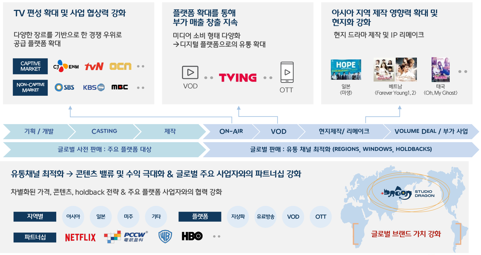 CJ ENM 산하 채널 tvN, OCN 등의 채널과 국내외 방송사들, CJ ENM의 OTT 플랫폼 TVING과 글로벌 OTT 플랫폼 넷플릭스 등을 통해 안정적이고 유리한 조건으로 편성 및 판매를 진행하고 있습니다. K콘텐츠 (K팝, K드라마, K무비, K뷰티 등) 열풍과 더불어 코로나 19로 인한 OTT 시장, 미디어 시장의 수요 급증 마지막으로 치열해지는 OTT 간의 경쟁까지 모든 기회가 스튜디오 드래곤으로 향하고 있으며 스튜디오 드래곤은 최상의 제작 환경을 만들어 대응해나가고 있습니다.