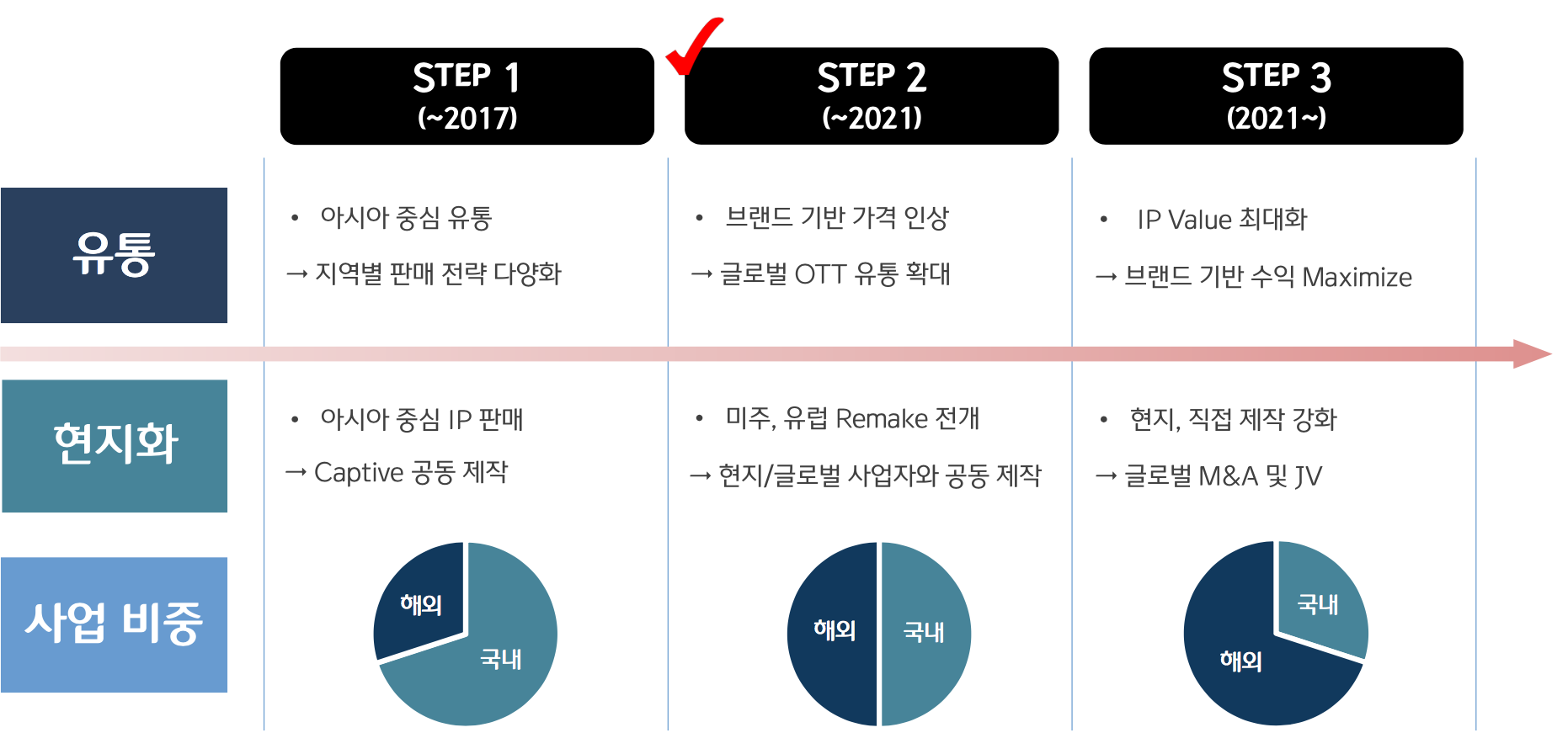 2019년 초 스튜디오 드래곤은 "보유한 IP를 활용해 중국 제작사와 함께 중국 드라마를 제작하는 프로젝트는 현재 논의하고 있으며 드라마 <나의 아저씨>, <김비서가 왜 그럴까>, <백일의 낭군님>의 포맷을 판매해 중국에 맞도록 현지화해 제작한다."라고 밝힌 바가 있어 한한령 해제가 본격화된다면 공동 제작 모멘텀은 더욱 가속화될 것으로 보입니다.
