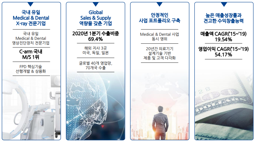 코스닥 상장 전 박병욱 제노레이 대표는 “2020년까지 덴탈 엑스레이 시장에서 글로벌 톱 5 안에 드는 기업으로 성장하겠다.”라고 밝힌 바 있습니다. 과연 올해 그 목표를 달성할 수 있을까요? 코로나 19로 인해 세계 경제가 크게 위축되었지만 K방역, K바이오, K의료기기 등이 주목을 받고 있는 지금 기회를 잘 잡는다면 글로벌 시장 점유율 확대도 충분히 가능하지 않을까 생각됩니다.