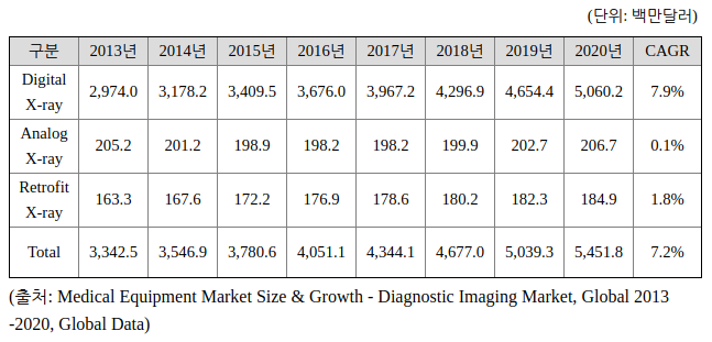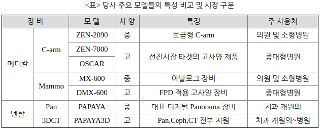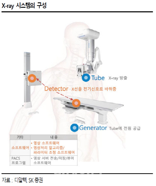 제품 연구, 개발부터 제조, 판매까지 전 과정을 내재화하는 전략도 경쟁 우위 요소중 하나입니다. 연구/개발에 있어서는 자체 평판 디텍터(Flat-Panel Detector, 이하 FPD) 개발과 생산기술로 좋은 성과를 보고 있습니다. X-ray를 구성하는 부품 및 모듈 중 제일 고가이면서 핵심이라 할 수 있는 부품에는 X-ray tube, Detector(센서), Generator가 있습니다. 디텍터는 엑스레이 촬영 시 디지털 영상을 구현하는 부품이며 현재 시장에서는 고품질 영상에 대한 사용자들의 지속적인 수요로 인해, X-ray Detector(센서) 사용이 FPD 장착 중심으로 재편되는 중에 있습니다.