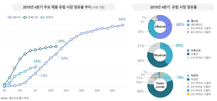 주요 제품으로는 램시마 2종(IV와 SC / 류마티스 관절염 등), 허쥬마(유방암, 위암 등), 트록시마(림프종, 류마티스 관절염 등), 고덱스(간질환 치료제)가 있습니다. 셀트리온의 제품들은 유럽시장에서 출시 이후 엄청난 속도로 시장 점유율을 높여갔고 현재 상당히 높은 시장 점유율을 보여주고 있습니다. 19년 4분기 유럽 시장 점유율을 보면 램시마가 60%로 점유율 1위, 허쥬마는 39%로 1, 2위를 다투고 있고, 허쥬마는 19%로 2위를 차지하고 있습니다. 미국시장에서는 인플렉트라(램시마)가 10.1%로 2위, 트룩시마가 7.9%로 2위를 차지하고 있고 지난 3월 허쥬가마 런칭되었습니다.
