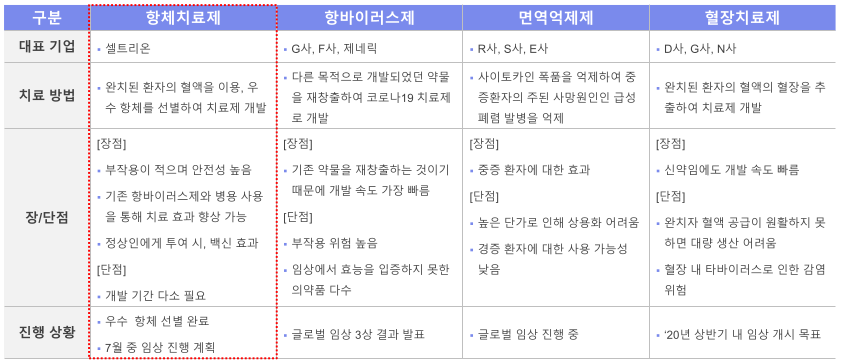 셀트리온이 개발 중인 항체 치료제의 경우 완치된 환자의 혈액을 이용하여 우수 항체를 선별하여 치료제를 개발하는 방식을 취하고 있습니다. 장점으로는 부작용이 적어 안전성이 높으며 기존 항바이러스제와 병용 사용이 가능해 치료 효과를 향상시킬 수 있습니다. 정상인에게 투여 시 백신 효과를 보이기도 합니다. 하지만 개발 기간이 다소 필요하다는 점 흠이라고 볼 수 있습니다. 항체치료제를 개발 중인 대표기업으로는 셀트리온과 일라이 릴리가 있으며 일라이 릴리는 지난 6월 임상 시험에 돌입했습니다.