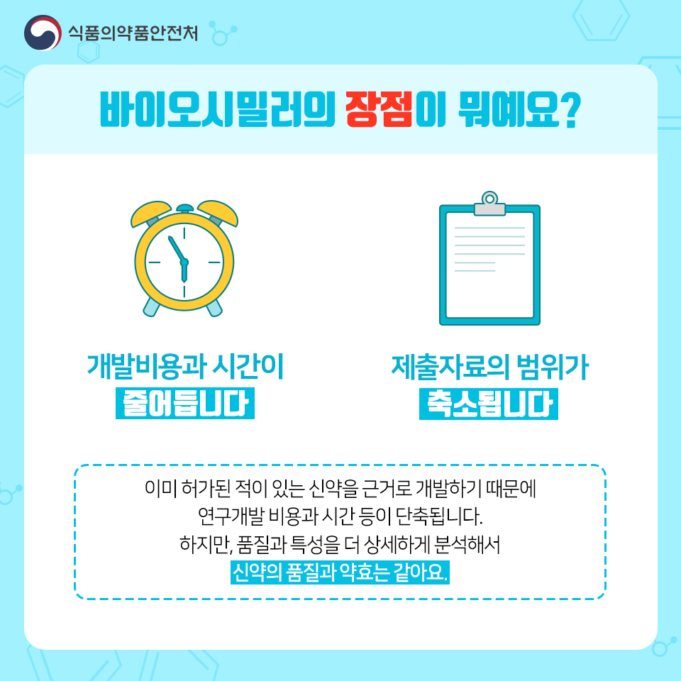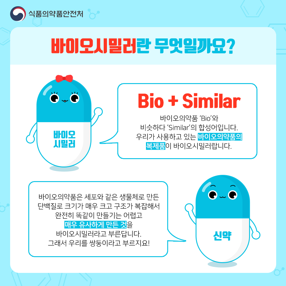 바이오 시밀러 : 오리지널 바이오의약품의 특허 기간이 끝난 뒤 이를 본떠 만든 비슷한 효능의 복제약.
