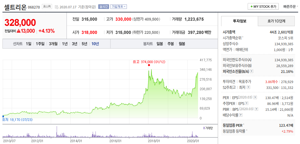 바이오 붐이 일었던 2018년 이후 다시 전고점을 향해 달려가고 있는 셀트리온입니다. 엄청난 상승세 덕에 7월 17일 종가 기준 시총이 44조 2,601억원으로 코스피 5위입니다. 과연 수많은 모멘텀을 두고 있는 셀트리온이 전고점을 넘어 날아갈 수 있을까요?