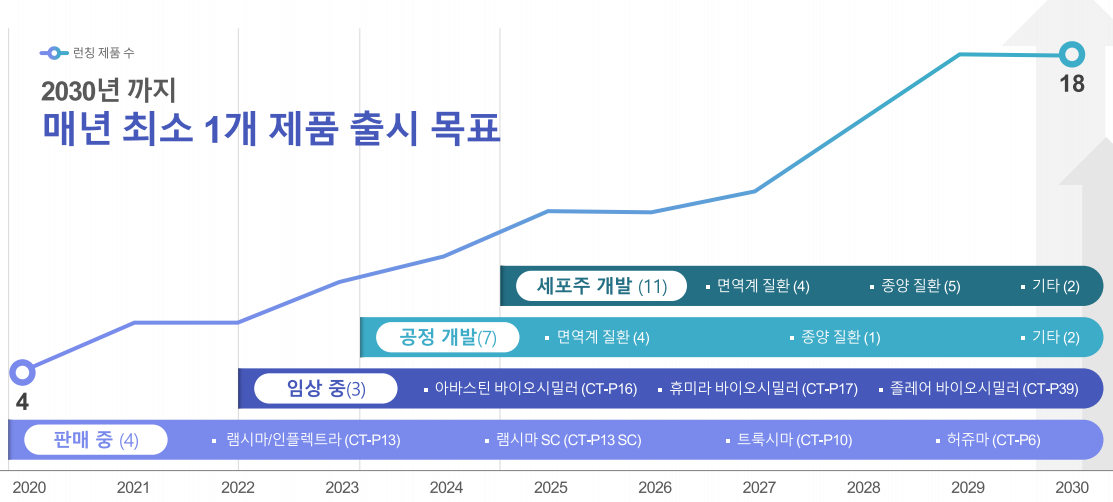 진행 상황으로는 작년 글로벌 매출 24조 원이며 전체 처방의약품 시장에서 1위를 기록한 휴미라의 바이오시밀러(CT-P17)는 유럽에서의 허가를 기다리고 있고 미국은 허가 신청 준비중입니다. 뒤이어 작년 약 8조 5000억 원의 매출을 기록한 아바스틴의 바이오시밀러(CT-P16)와 작년 약 3조9000억 원의 매출을 올린 졸레어의 바이오시밀러(CT-P39)가 임상을 진행 중입니다. 스텔라라의 바이오시밀러(CT-P43)도 최근 임상 1상에 착수했습니다. 스텔라라의 경우 작년 약 8조 원의 매출을 기록하였습니다.