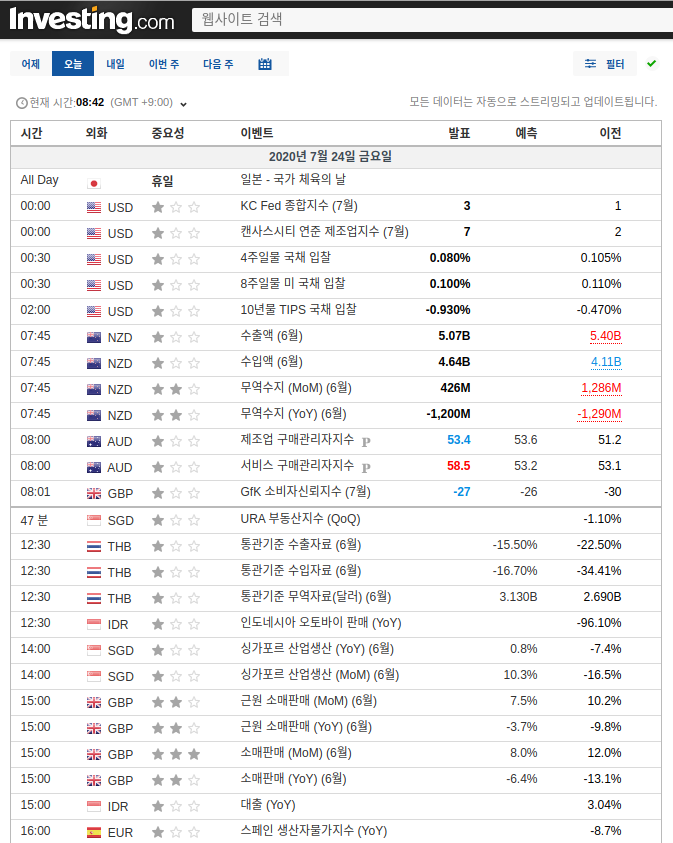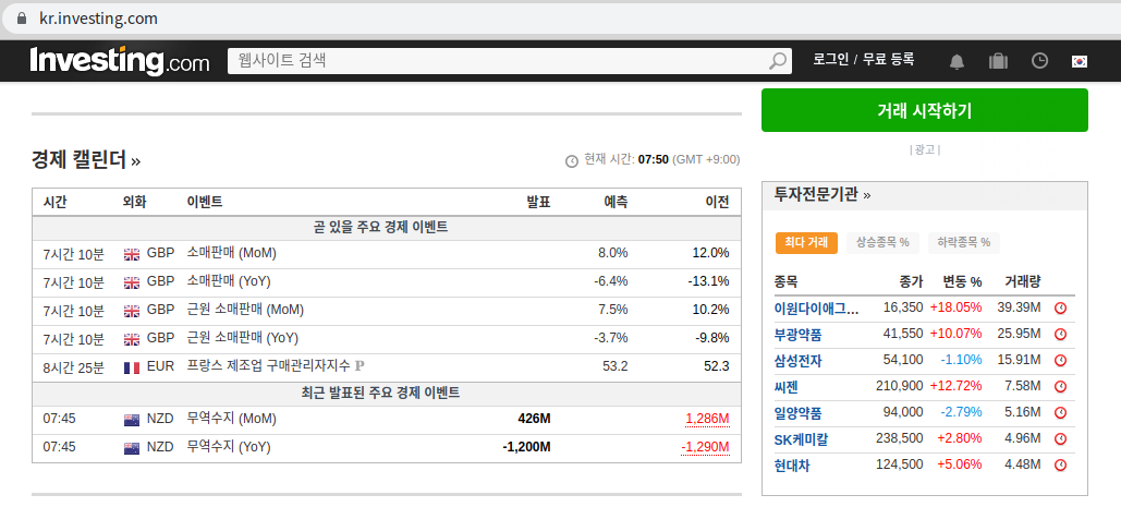 인베스팅 닷컴의 첫 홈페이지에서 스크롤을 내리다 보면 경제 캘린더 파트가 나오게 됩니다. 경제 캘린더에서는 앞으로 발표가 예정된 경제지표 발표를 시간 순으로 나열하고 있습니다. 아래쪽에는 이전에 발표되었던 가장 가까운 경제지표를 보여주고 있습니다. 7월 24일 07:50 기준 영국 소비판매, 프랑스 제조업 구매자 관리지수 등이 발표를 앞두고 있고 07:45에 뉴질랜드 무역수지가 발표되었던 것을 확인하실 수 있습니다.
