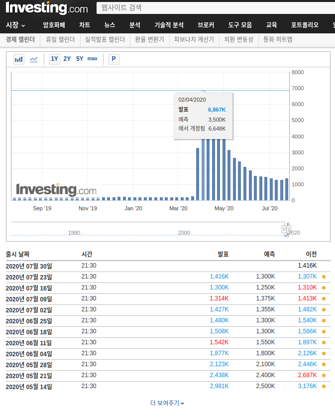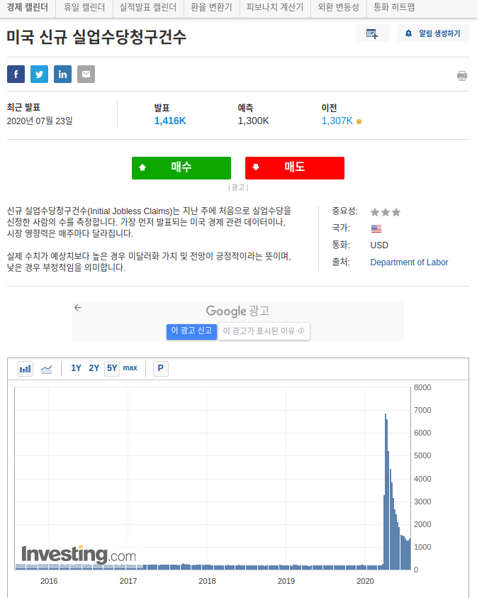 세부 페이지로 넘어오게 되면 최근 발표 일자, 발표, 예측, 이전 발표 수치를 보여주고 지표에 대한 간단한 설명을 해주고 있습니다. 미국 신규 실업수당 청구건수의 경우 '신규 실업수당 청구건수(Initial Jobless Claims)는 지난주에 처음으로 실업수당을 신청한 사람의 수를 측정합니다. 가장 먼저 발표되는 미국 경제 관련 데이터이나, 시장 영향력은 매주마다 달라집니다. 실제 수치가 예상치보다 높은 경우 미달러화 가치 및 전망이 긍정적이라는 뜻이며, 낮은 경우 부정적임을 의미합니다.'라고 설명하고 있습니다. 아래쪽으로 내려보면 1년, 2년, 5년, 최대치의 차트를 볼 수 있고 그 밑에는 발표 별 정확한 수치를 표로 볼 수 있습니다.