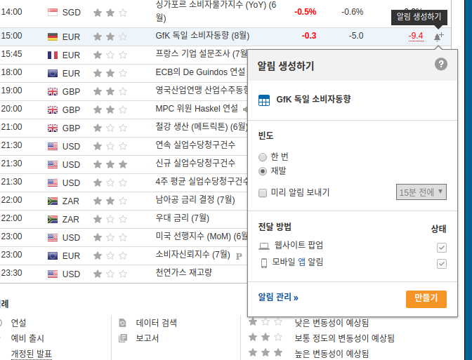인베스팅 닷컴은 주요 경제 지표를 놓치지 않게 알림 기능을 제공하고 있습니다. 웹사이트 팝업으로도 전달을 받을 수 있고 인베스팅 닷컴 모바일 앱으로도 알림을 받을 수 있습니다. 우리의 시계처럼 빈도도 설정할 수 있고 지표 발표 몇 분(15분, 30분, 60분) 전에 알림을 받을지 설정할 수도 있습니다. 물론 회원가입을 하셔야 이용이 가능합니다.
