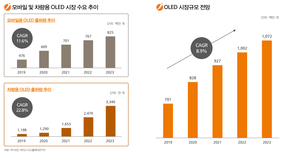 당장 자동차만 보아도 OLED가 곳곳에 접목되며 강화유리도 곳곳에 필요하게 되었습니다. 각종 모델과 디자인 콘셉트카 등에서 쉽게 OLED를 확인할 수 있습니다. 아우디의 버추얼 익스테리어 미러, 벤츠의 OLED 인포테인먼트 시스템, 도요타 외부 OLED 디스플레이, 파나소닉 고성능 OLED 소재까지 단적인 예이지만 모든 글로벌 기업들이 앞다투어 OLED를 채용하고 있습니다. OLED 출하량 추이 이를 스마트 가전, 스마트 홈까지 확대한다면 강화유리는 없어서는 안 될 존재가 될 것이며 강화유리 시장의 성장 역시 가파를 것으로 보입니다.