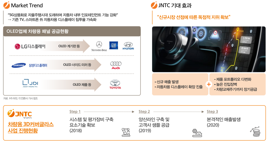 2018년 제이앤티씨는 장비 구축 및 기술(반사방지, 눈부심 방지, 3D 성형 및 인쇄 기술 등)을 확보하고, 19년 생산라인 구축 및 고객사에 샘플을 공급했습니다. 그리고 올해 20년 본격적인 양산을 시작해 매출을 발생시킬 예정입니다. 독일 자동차 회사 BIG 중 1곳 향 매출이 발생할 것으로 사측이 밝혀 주목을 받기도 했습니다. 차량용 3D 커버글라스에 대한 정보가 거의 없으며 하반기가 되어야 자세한 사항들을 확인할 수 있을 것으로 보입니다.