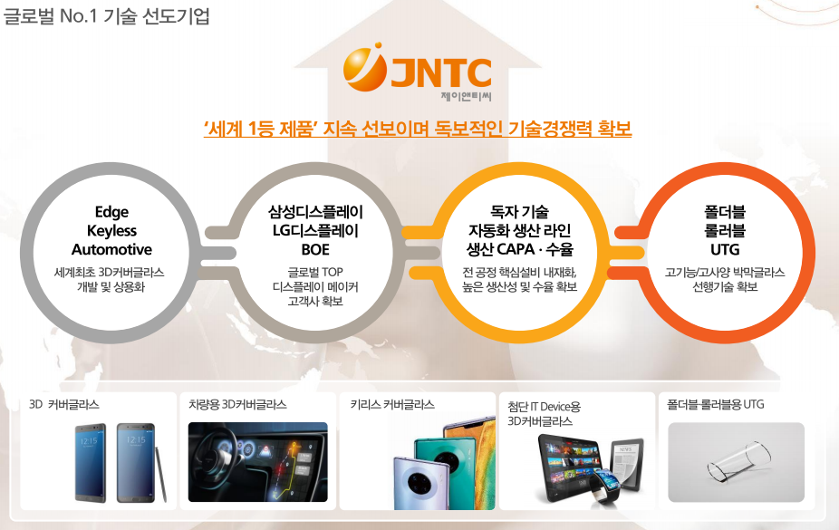 제이앤티씨는 진우엔지니어링을 모회사로 두고 20년 3월 4일 코스닥 시장에 상장한 따끈따끈한 스마트폰 부품주입니다. 스마트폰의 3D 커버 글라스와 후면 카메라 윈도우 글라스, 그리고 커넥터를 양산하고 있으며 최근 차량용 커버글라스를 생산하고 있습니다. 2014년 세계 최초로 3D 커버글라스 제조에 성공했고 고기능 고사양 박막 글라스 선행기술을 기반으로 폴더블, 롤러블 UTG 시장 진입을 준비 중입니다. 삼성디스플레이, LG디스플레이, BOE 등을 고객사로 두고 있으며 차량용 글라스 고객사가 독일 BIG 3 중 하나임을 밝히기도 했습니다.