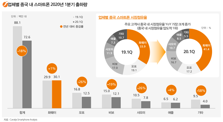 구글의 서비스가 중국에서 금지되면서 화웨이는 안드로이드 OS를 사용하지 못해 해외 시장에서는 고전을 면치 못하고 있지만 중국인들의 애국심 덕분인지 화웨이가 점유율이 더욱 높아지고 있습니다. 카운터포인트리서치에 따르면 화웨이의 2분기 중국 스마트폰 시장 점유율을 46%에 달하는 것으로 발표했습니다. 화웨이의 5G 점유율은 압도적이었는데, 2분기 중국 5G 스마트폰 시장의 60%를 차지했습니다. 제이앤티씨의 커버글라스 기술이 적용된 화웨이의 P40 Pro는 중국 내 스마트폰 4월 판매량 5위를 기록하기도 했습니다. 미국의 제재가 화웨이의 스마트폰에도 큰 영향을 미칠 것으로 보이며 이는 제이앤티씨에게도 큰 악재일 것으로 보입니다.
