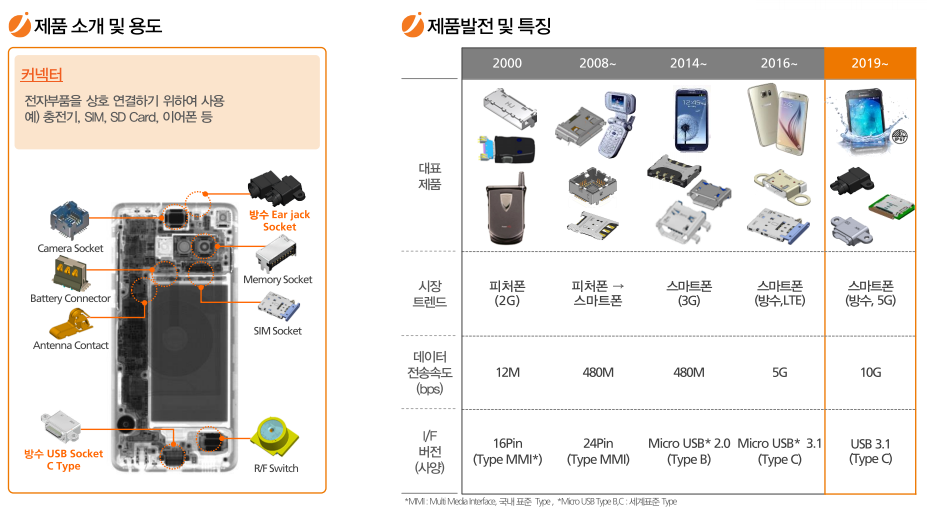 최근 휴대폰 및 디스플레이 기기들이 디지털 및 스마트화되면서 대용량 고속 신호 전송 필요성이 대두되며 커넥터 시장도 동반 성장하였습니다. 과거에는 장착되지 않았던 고기능성 커넥터가 휴대폰 사양의 발달로 인하여 새로 장착되게 되자 휴대폰 한대당 들어가는 커넥터의 개수는 감소하였으나 판매단가는 증가하였습니다. Bishop & Associates에 따르면 국내 휴대폰 커넥터 시장 출하 금액은 2015년 3조 3500억 원에서 2018년 4조 600억 원으로 연평균 6.6% 증가하였으며, 시장환경, 업황 등을 감안 시 이후 연평균 8.2% 성장하여 2020년에는 4조 7500억 원의 시장을 형성할 것으로 전망됩니다.