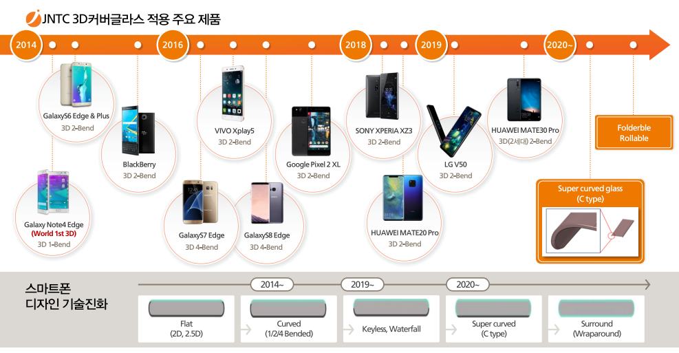 기존에는 스마트폰에 사용되는 강화유리의 대부분은 중국 업체인 렌즈 테크놀로지(Lens Technology)와 비엘 크리스털(Biel Crystal)등으로부터 공급받았으나, 3D커버글라스로 디스플레이 디자인이 변화되면서 상대적으로 기술력의 차이를 가진 업체의 생산량이 늘어나고 있는 추세입니다. 3D 2세대 제품군은 유리 곡면의 각도가 90도에 근접한 제품으로 현재까지 출시된 3D 글라스 중에서는 가공 난이도가 가장 높은 제품이며 2019년 하반기부터 본격 양산되었습니다. 향후 스마트폰 디스플레이 모델의 난이도가 향상됨에 따라 기술력이 상대적으로 높은 제이앤티씨의 시장 점유율은 더욱 높아질 것으로 예상됩니다.