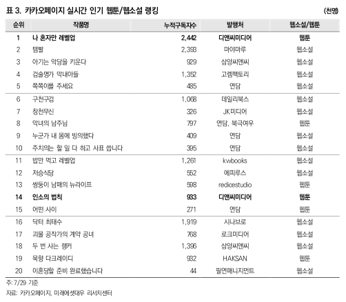 <나 혼자만 레벨업>은 연재가 끝났음에도 불구하고 카카오페이지에서 인기순위 1위를 달리고 있습니다. 2위 <템빨>과 함께 압도적인 누적 구독자수를 보여주고 있습니다. 또한 유일하게 인기순위 상위 20위 안에 2개의 작품(나 혼자만 레벨업, 인소의 법칙)을 올려놓고 있습니다. 카카오재팬의 만화 플랫폼인 픽코마에서도 <나 혼자만 레벨업>은 실시간 랭킹 1위를 달리고 있으며 좋아요 수는 가히 압도적입니다. 픽코마는 라인 망가와 함께 일본 최대 웹툰 플랫폼 중 하나입니다.